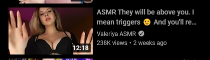 >>100335 Так. Спокойно. Это всё-таки не порнуха. Тут эстетика в нежности и ненавязчивости. С лёгким налетом интима. Кого-то не устраивает, пиздуют мотреть аморант тыкающую себе в пизду вибраторы. Тоже асмр'ом себя называет.