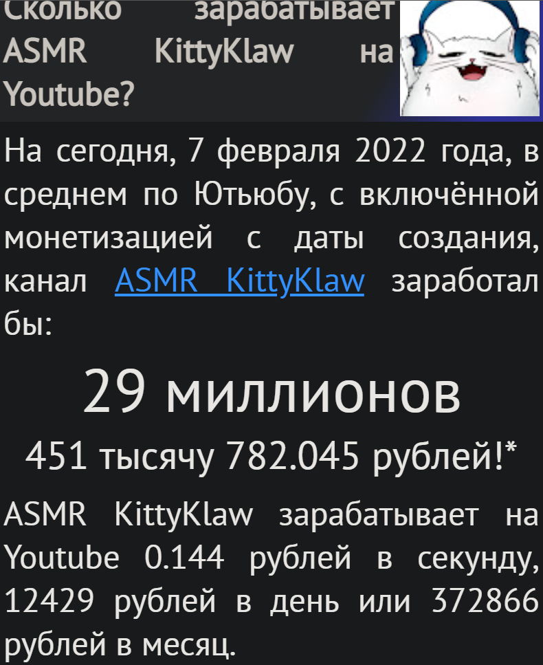 >>96212 Добавлю, что у Тани 6 лямов просмотров было ТОЛЬКО НА ПИКЕ КАРЬЕРЫ, сейчас же там далеко не такие показатели! А кити клав это обычные просмотры