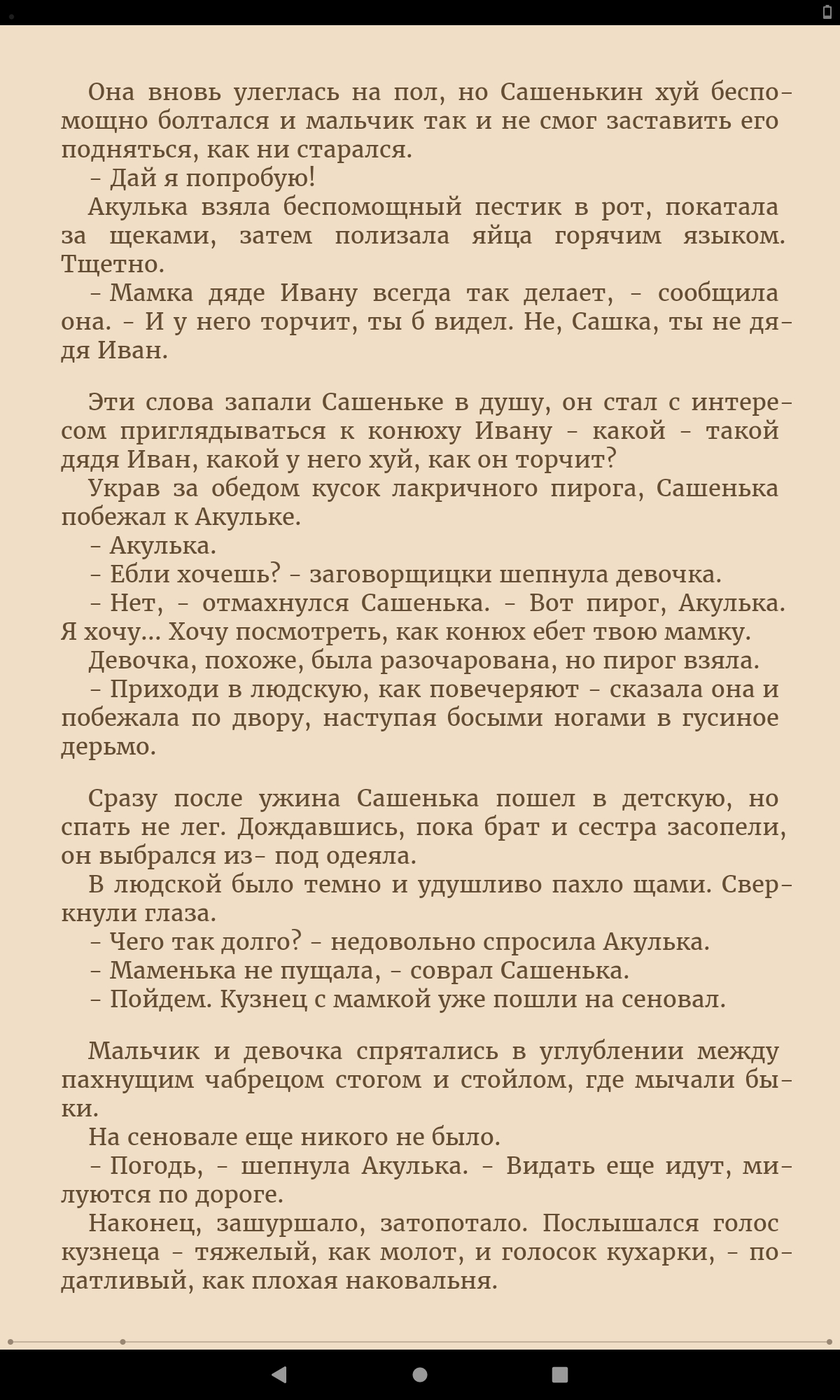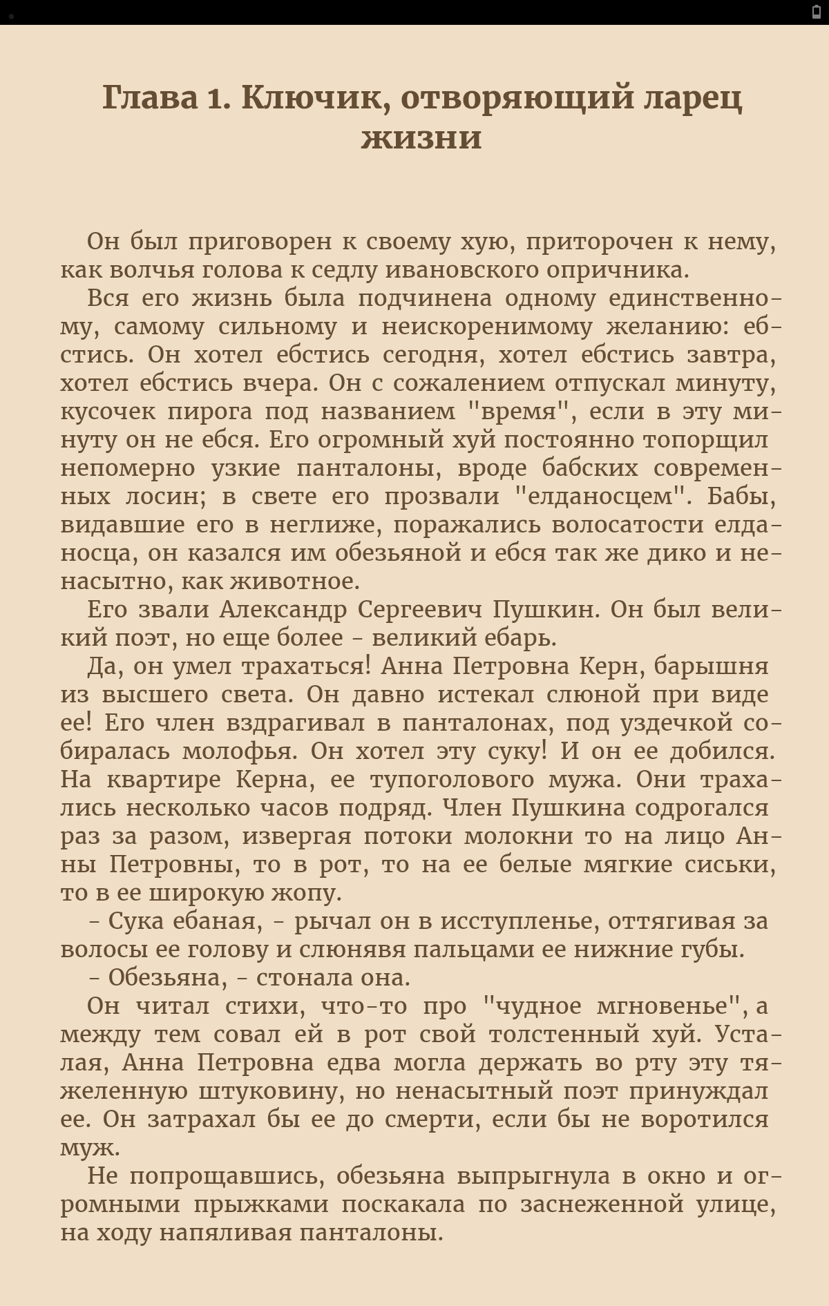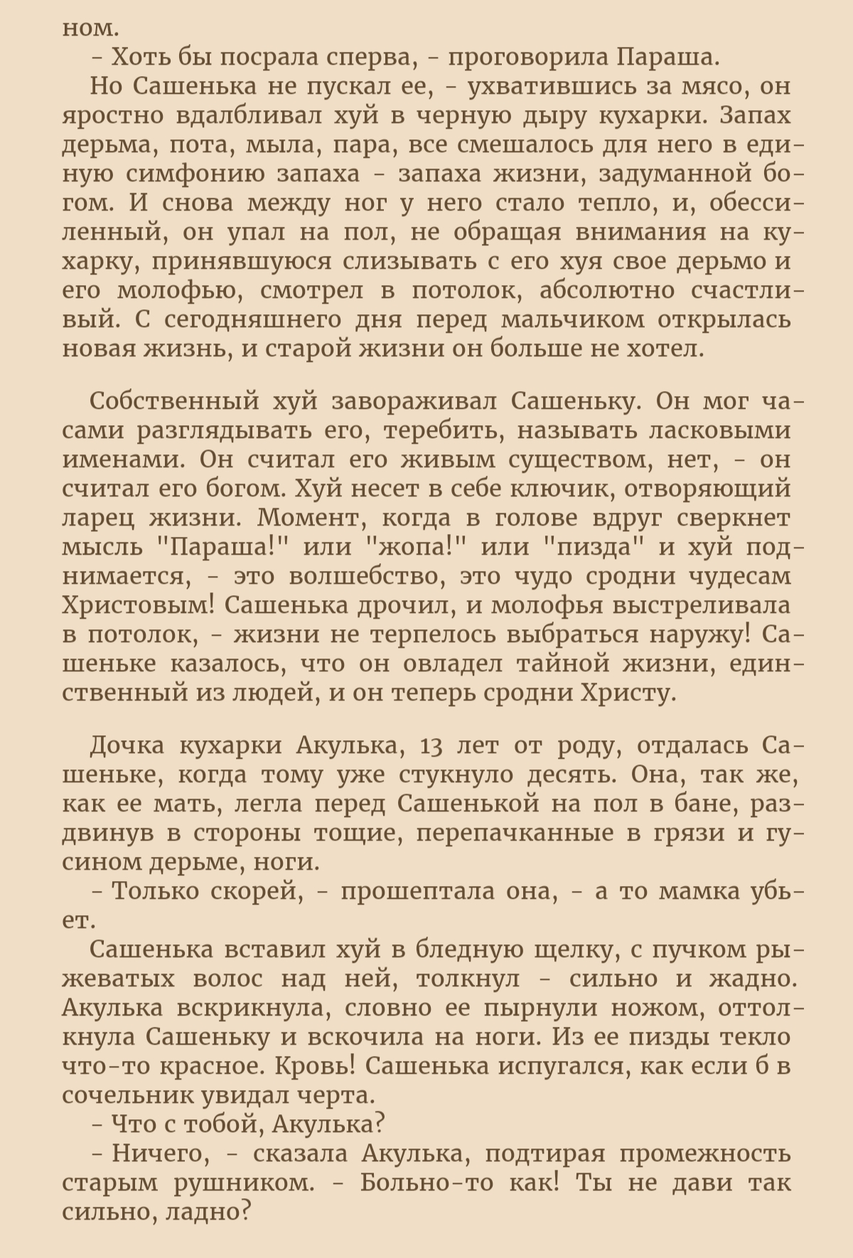 >>3972047 >Все это мы уже проходили. На самом деле существует система сдержек и противовесов, выработанная годами на которую я успешно кладу биту, и вообще, я совсем не против проснуться с исполосованными ягодицами. А что, поиск приключений на общую задницу - интересный такой способ сдерживания непослушной личности! Представляю, с какой кислющей моськой ей приходится пропускать через себя эти ни с чем не сравнимые ощущения. Отвожу глаза в сторону и пытаюсь давить с лица улыбочку. А еще мне что-то подсказывает, что ты не прочь позлоупотреблять такими... профилактическими процедурами. Исключительно ради спокойствия и порядка в своей черепной коробке, разумеется! >А уж срать под себя Маргоша точно не станет. Понимаешь, к чему я веду? Ее война изначально обречена на провал. Ну знаешь, а вдруг она решит тебе отомстить за особенно болезненное полосование ягодиц? Это странно и глупо, но в наши дни такое поведение аватарок совсем не редкость. Всего можно ожидать, даже неприятного утреннего сюрприза в постели. >Ничего ты не поняла, Паразит - это Глазун, мой папаша! А кто тогда твоя мамаша? >РЕБЯТА, КТО НОВУЮ КНИГУ ПЕЛЕВИНА ЧИТАЛ? А мне вот нравится такое сочетание сеттинга и стиля. Трэш и кринш, но зато не изъезженный взгляд на старые добрые времена как на сплошной монастырь, а цветная картинка с живыми человеками. Даже очень отдаленно напомнило Бунина.