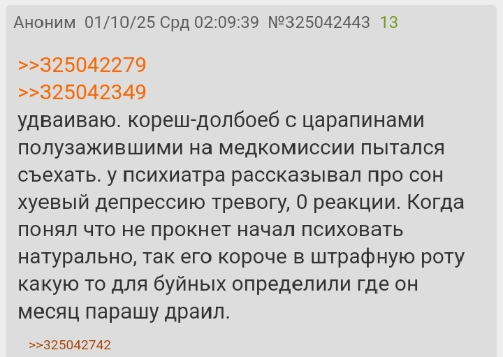 тряска пошла)) помню мы стояли в линейке перед ними, там додики че то говорили комбату с пожалуйста, извините и тд, а он в ответ бычил им и как с няшам разговаривал, а когда до меня очередь дошла то он со мной нормально разговаривал без выебонов, потому что знает что я могу вскрыться и кровью там все залить)) только вот лох и био-мусор почему то я, а не вы степашки)) до сих пор в памяти отложилось)))