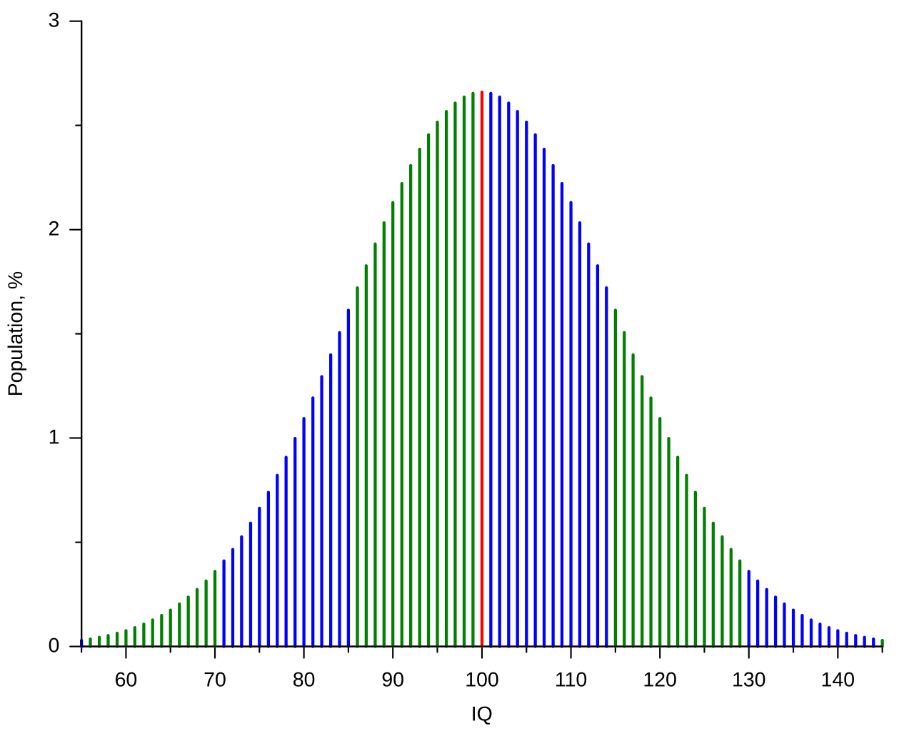 >>3980267 https://ru.wikipedia.org/wiki/%D0%9A%D0%BE%D1%8D%D1%84%D1%84%D0%B8%D1%86%D0%B8%D0%B5%D0%BD%D1%82_%D0%B8%D0%BD%D1%82%D0%B5%D0%BB%D0%BB%D0%B5%D0%BA%D1%82%D0%B0 Тесты IQ разрабатываются так, чтобы результаты описывались нормальным распределением с медианным значением IQ μ = 100 и стандартным отклонением σ = 15[1]. Если распределение IQ определено таким образом, то около 2⁄3 результатов (точнее, 68,3 %) находится между показателями 85 и 115, то есть в пределах одного стандартного отклонения от медианы. Около 50 % результатов попадает в пределы IQ = 100 ± 10. За пределами двух стандартных отклонений от медианы находятся около 4,6 % результатов: 2,3 % c IQ < 70 и столько же с IQ > 130. Значение IQ менее 70 часто квалифицируется как умственная отсталость.