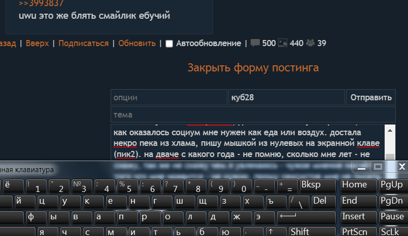 пыталась уйти из интернетов, даже всю технику выбросила, но как оказалось социум мне нужен как еда или воздух. достала некро пека из хлама, пишу мышкой из нулевых на экранной клаве (пик2). на дваче с какого года - не помню, сколько мне лет - не скажу, так же не скажу чем я увлекаюсь - чужое мнение насчёт того что мне нравится - не нужно. прошу сексистов мне не писать, скройте по нику