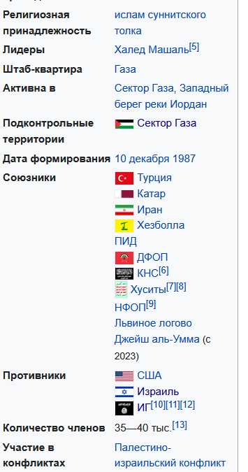 https://ru.wikipedia.org/wiki/%D0%A5%D0%90%D0%9C%D0%90%D0%A1 >ХАМА́С (араб. حَمَاس, х̣ама̄с, дословно— «воодушевление»[14]; полное название — араб. حَرَكَة اَلْمُقَاوَمَةِ الْإِسْلَامِيَّةِ, Х̣аракат аль-Мук̣а̄вама аль-ʾИсла̄мийя, дословно— «Исла́мское движе́ние сопротивле́ния») — палестинская исламистская суннитская террористическая[15] политическая и военная организация сопротивления[16], управляющая сектором Газа. Организация также активна и на Западном берегу реки Иордан. У ХАМАС есть военное крыло — бригады «Изз ад-Дин аль-Кассам», отвечающие за атаки на Израиль. Главным политическим соперником ХАМАС является ФАТХ. https://ru.wikipedia.org/wiki/%D0%92%D1%82%D0%BE%D1%80%D0%B6%D0%B5%D0%BD%D0%B8%D0%B5_%D0%A5%D0%90%D0%9C%D0%90%D0%A1_%D0%B2_%D0%98%D0%B7%D1%80%D0%B0%D0%B8%D0%BB%D1%8C Вторжение группировки ХАМАС в Израиль (названное ею операцией «Наводнение аль-Акса»[26], араб. عمليّة طُوفان الأقصى،) началось 7 октября 2023 года, когда палестинские вооружённые группировки, возглавляемые ХАМАС[c], проникли на территорию Израиля из сектора Газа, прорвав пограничный барьер и войдя в близлежащие израильские населённые пункты и на военные объекты. Ранним утром 7 октября произошли обстрелы Израиля из сектора Газы не менее чем 3000 ракетами и проникновение около 3000 боевиков с земли, моря и по воздуху на израильскую территорию, включая приграничные кибуцы и город Сдерот. Около 1200 израильтян были убиты (включая 364 участника музыкального фестиваля), ещё 251 были взяты в заложники[27]. Помимо массовых убийств гражданских лиц Израиля, имели место множественные случаи сексуального насилия[28][29][30]. Нападение стало крупнейшим массовым убийством евреев со времён Холокоста[31][32][33] и крупнейшим в истории актом палестинского терроризма[34][35].