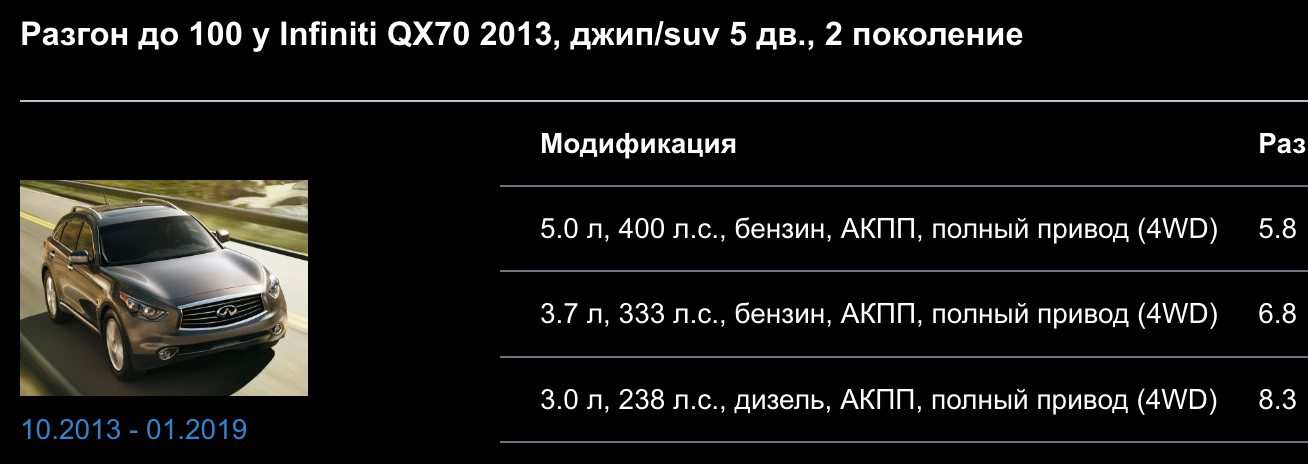 Слабая по сравнению с чем? С зелёной ламбой? 6.8 секунд, это быстрее 90% потока, алё бля. Динамики просто дохуища. Двачным мамкиным гонщикам с Ламбами понятно, машина должна ехать за 1 и 9 даста, но мы тут про реальность. А в реальности Инфинити валит и это факт. Могло быть быстрее, но машина 2 с хуем тонны весит хуле, Г35й с этим двиглом едет 5.8, 370Z за 5.1. Тут главное что она при своей классной динамике - меганадёжная. Здесь нет турбин и роботов, тут автомат и мощный атмодвигатель. Здесь ровно так, как должно быть! Этим QX70 и охуенен и пожалуй является лучшим, что есть на всей планете за свои деньги.