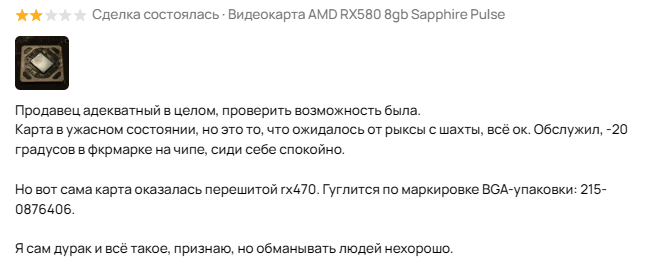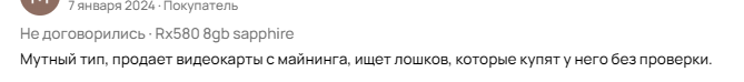 >>6649520 Честно вообще похуй, я знаю правду за ситуацию с видеокартой и я пытался удалить отзыв, общался с покупателем после отзыва и мы друг друга поняли. В той ситуации я его не наебывал, Меня просто самого наебали когда я покупал эту карту. И продавал её не пооому что она кривая, а просто чтобы купить более мощную.