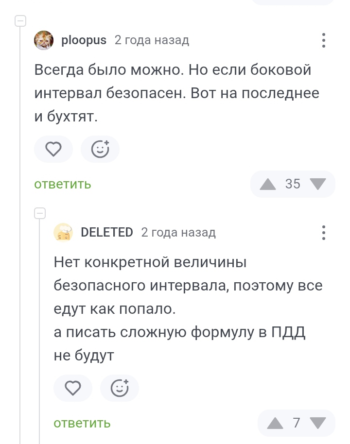 Эта статья что ты скинул ничего не объясняет. Ехать то вроде можно, но какой должен быть безопасный интервал - неизвестно. Если проехали то безопасный, если не влезли и дтп то опасный, а кто виноват? А хуй его знает.