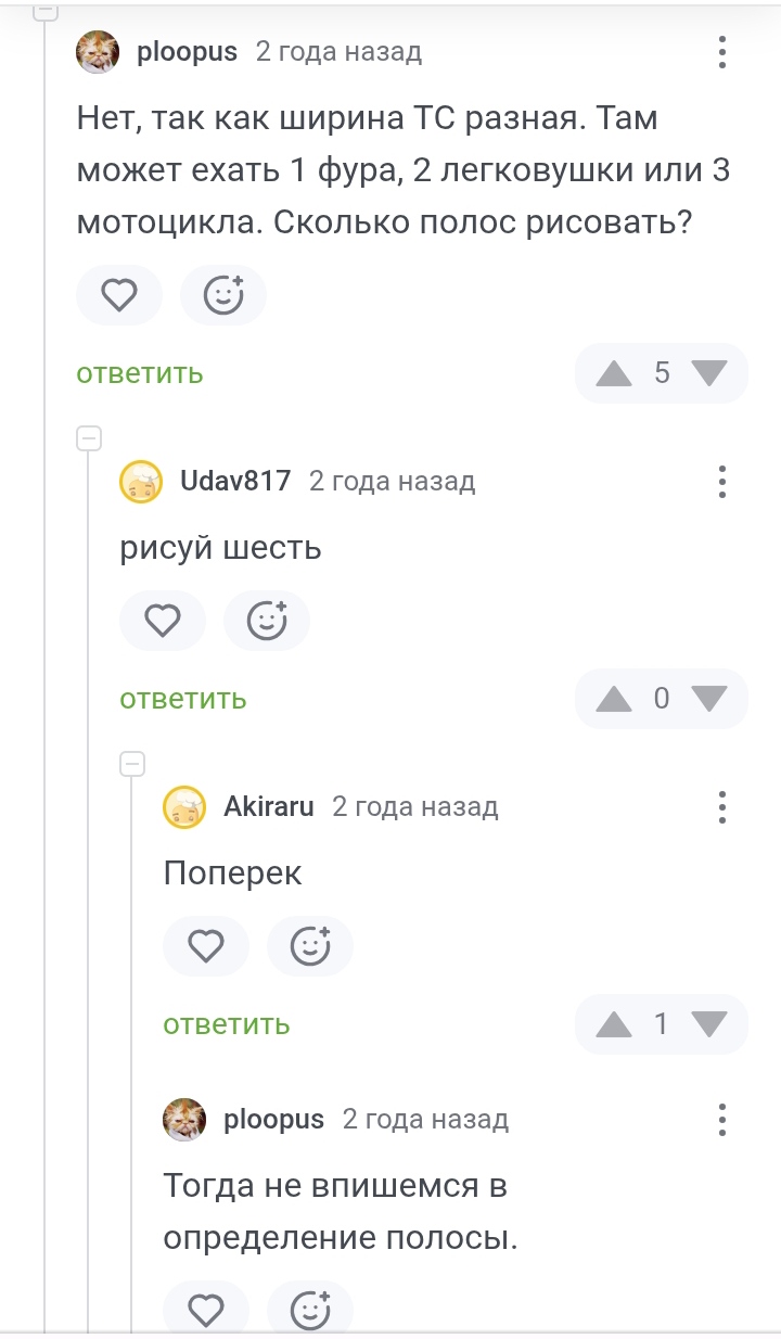 >>6675871 >>6675875 Долбоебы, спок. Если есть разметка то все ок. Но если по разметке полоса одна, но она шириной с два автомобиля. То хуй вам кто скажет кто прав - те кто едут в 2 ряда или кто хуярит посередине.