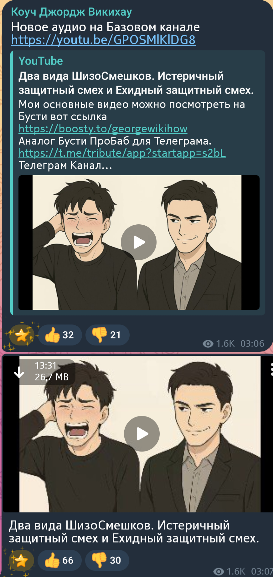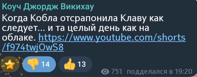 Или когда персонаж Жоры рассуждает что девушка с тату автоматически "непригодная", это реально уровень советской бабушки из 00х которая сидит на лавочке и обсуждает кто проститутка а кто наркоман, умора же. Жоре реально надо в театр, или стендап, смешно отыгрывает, любит кривляться на камеру итд, да и персонажи забавные, на авто канале была пародия на чёткого пацана на тазу и некробэшках, Джордж Викихау вполне зачётная пародия на современных "Коучей по отношениям" и прочих инфоцыган, ему рил в театральный надо