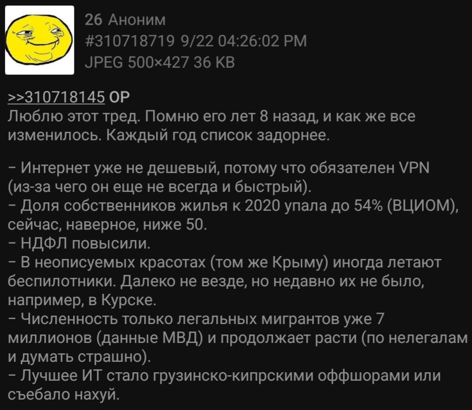 >>6682292 >ватаны имеют доступ к ютубу, а подсвiнки нет Кстати да, я бы давал доступ в западный сегмент интернета с условием прохождения психологических тестов. Если ты внушаемый нищий озлобленный навальнёнок, то сиди смотри рутуб, ибо нехуй. А если ты зрелый состоявшийся ватан, которого не сбить с толку хуесосам на подсосе usaid, тогда велком - вреда не будет