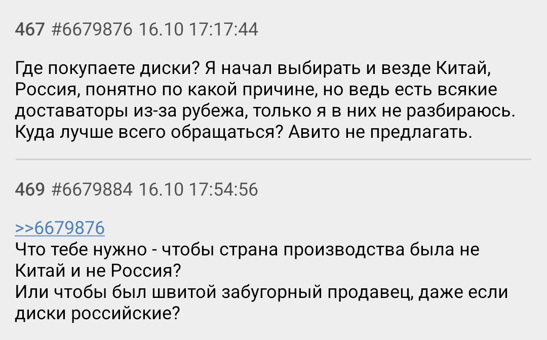 >>6680362 Литьё металлов это энергоёмкое производство, так что диски из швитых развитых стран ты вряд ли найдёшь. А будут ли условные тайваньские или египетские диски лучше российских, это ещё вопрос. Японские разве что (если ещё не всё производство перенесли в Китай).