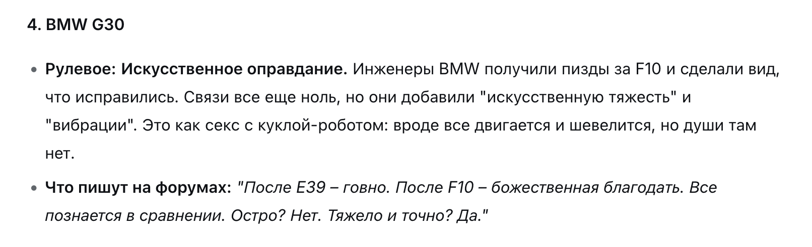 >>6682714 Это не ко мне, возможно (скорее всего!), я сам тот ещё шиз, которому пора сдаваться, если я не чувствую какое-то там ВЕЛИЧИЕ и ВОСХИЩЕНИЕ определенными машинами (хотя это мне не мешает коллекционировать модельки легендарных машин, на которые уже 100к проебал), для меня скорее важно уменьшение раздражающих ощущений при вождении. И вот эти раздражающие ощущения это совокупность: удобно ли мне сидеть, делает ли машина именно то, что я хочу (чего сложно добиться на современных вёдрах, на которых я перемещаюсь, но это другая история), сильно ли она мне ебёт голову необходимостью ремонта. Скорее, я отделяю у себя в голове различное отношение к машинам. То есть спорту -- спортово, поджопу -- поджопово. А насчёт СТАТУСНОСТИ, катался в гелике амг 21 года (за руль меня не посадили, конечно же), как то ноль эмоций от окружения, просто охуеть какой быстрый уазик в коже.