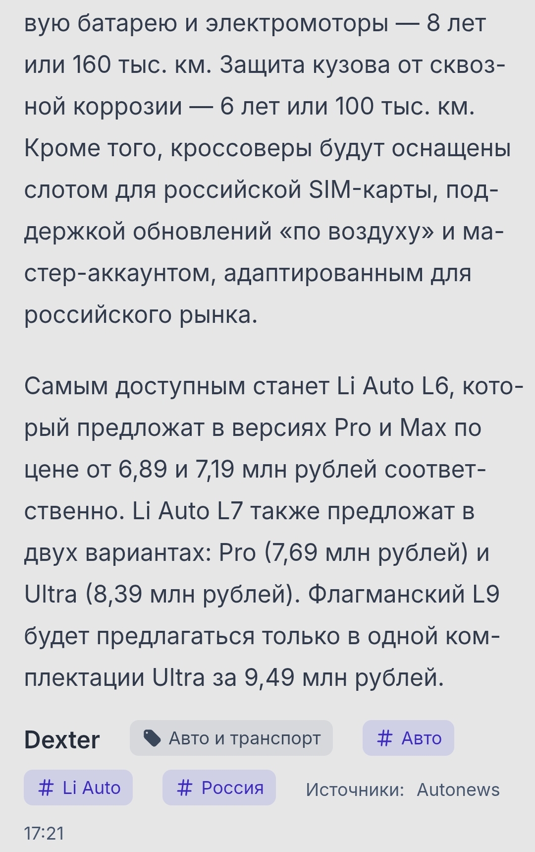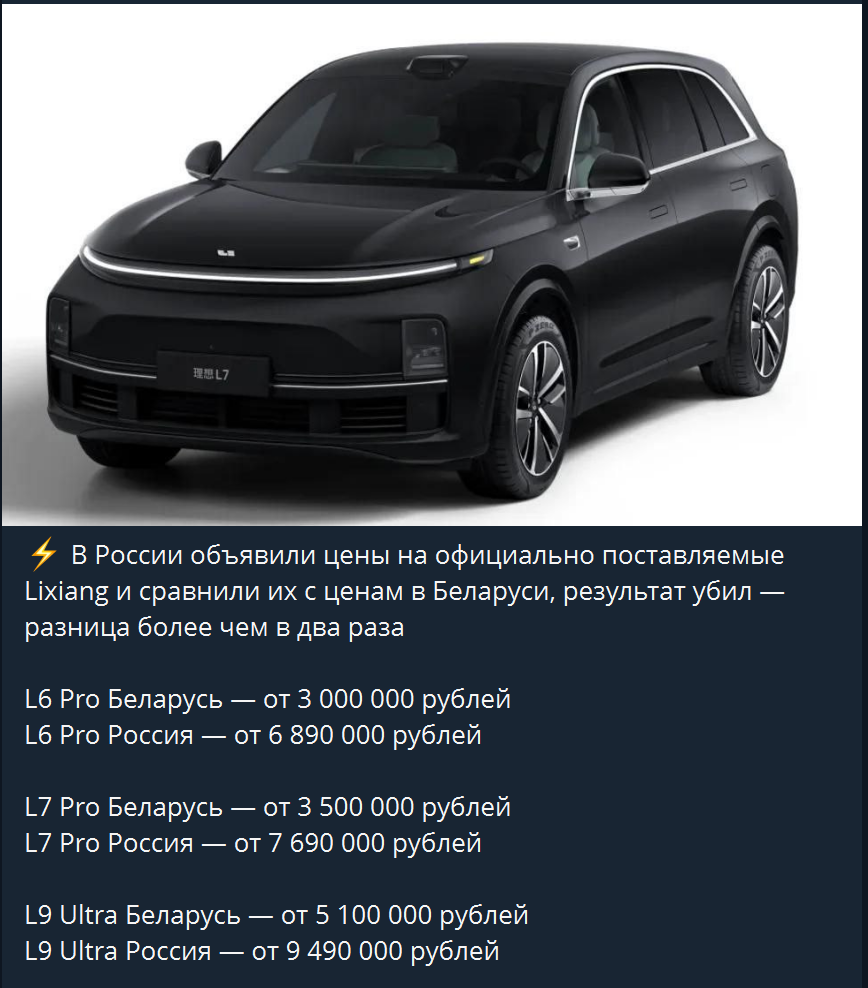 >Цены на автомобили в Казахстане: >Li L6 — Pro от 19978000 тенге (3070000 руб.), Max от 22217000 тенге (3400000 руб.); >Li L7 — Pro от 23090000 тенге (3550000 руб.), Ultra от 27856000 тенге (4300000 руб.); >Li L9 — Pro от 31413000 тенге (4850000 руб.), Ultra от 33513000 тенге (5150000 руб.).