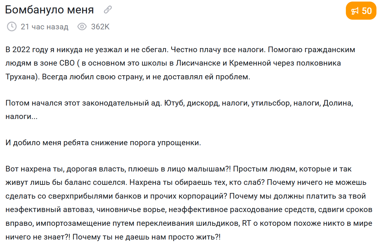 >>6708115 (OP) На рашке предлагают отменить ИП. Заместитель председателя комитета госдумы по экономической политике артем кирьянов спрогнозировал упразднение ИП. Это связано с тем, что предприниматели, пользуясь свои статусом, при помощи серых схем уходят от уплаты налогов, сообщает радио «Говорит Москва».