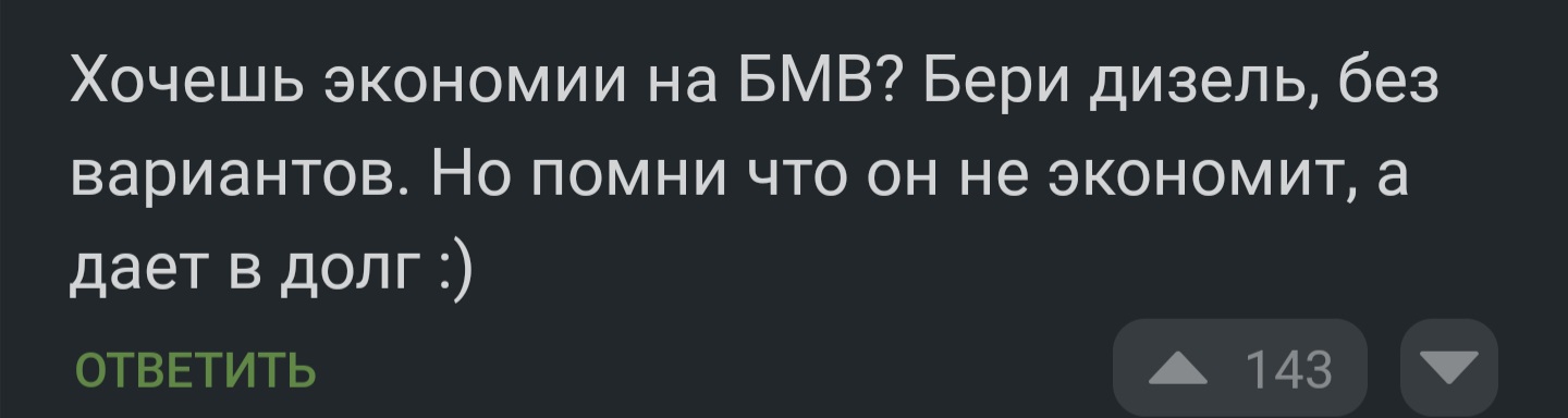 >>6717167 Не знаю, что там говорит ховеродаун. Но. Допустим, бензиновая машина жрёт 10 литров на сотку, а дизель 7 литров. При цене бенза 67, а дизеля 75 получаем стоимость на 1000 км в 6700 и 5250 рушлей соответственно. Экономия на дизеле ~1500 рушлей. К моменту попадоса тип на бнв >>6717158 проехал 150.000 км, т.е. сэкономил 225.000 рушлей. А потом отдал долг дизелю всадил 305.000 рушлей на ремонт топливной. Тип на RR отделался дешевле, потому что поставил какие-то "ремонтные" форсунки. Если бы поставил оригу, то это стоило бы 7*70к = 490.000 рушлей за одни материалы, не считая работ. Так понятнее?