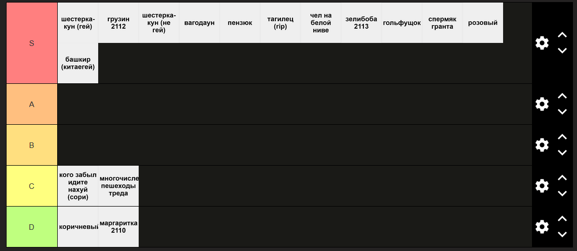 Как-то та видится. S: тупо местные петухи, отребье, сблев. B: есть они и есть. В зоопарке должны быть чем-то примечательные особи C: активно сношают свои тазы, что является сутью тазовладения D: двигают тред и не дают ему тонуть на главной и в говняке от asS-tier