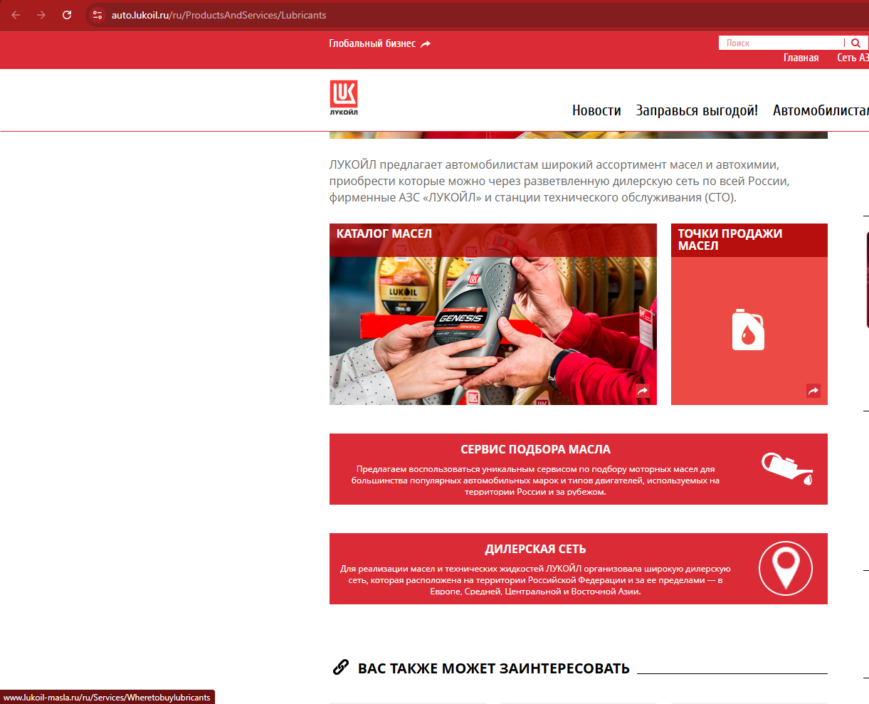 >>6720844 Идешь на большой сайт Лучка, который lukoil.ru Тыкаешь там продукция -> автомобилистам -> масла и автохимия -> точки продажи масел. Попадаешь на lukoil-masla.ru. Тыкаешь там на интернет-магазин для физических лиц. Попадаешь на ru.lukoil-shop.com. Доставка СДЕКом. Ну или можешь зайти в официальные витрины на маркетплейсах, там на них ссылки тоже есть.