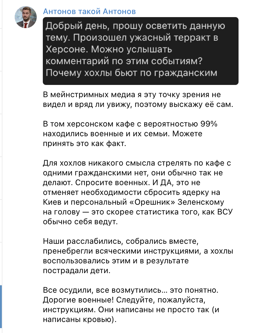 Ой что делается-то, кремлевская пропагандошка Гандонов такой Гандонов тоже говорит, что в Херсоне зажмурили законные военные цели, а не невинный мирняк хнык-хнык плаки-плаки.