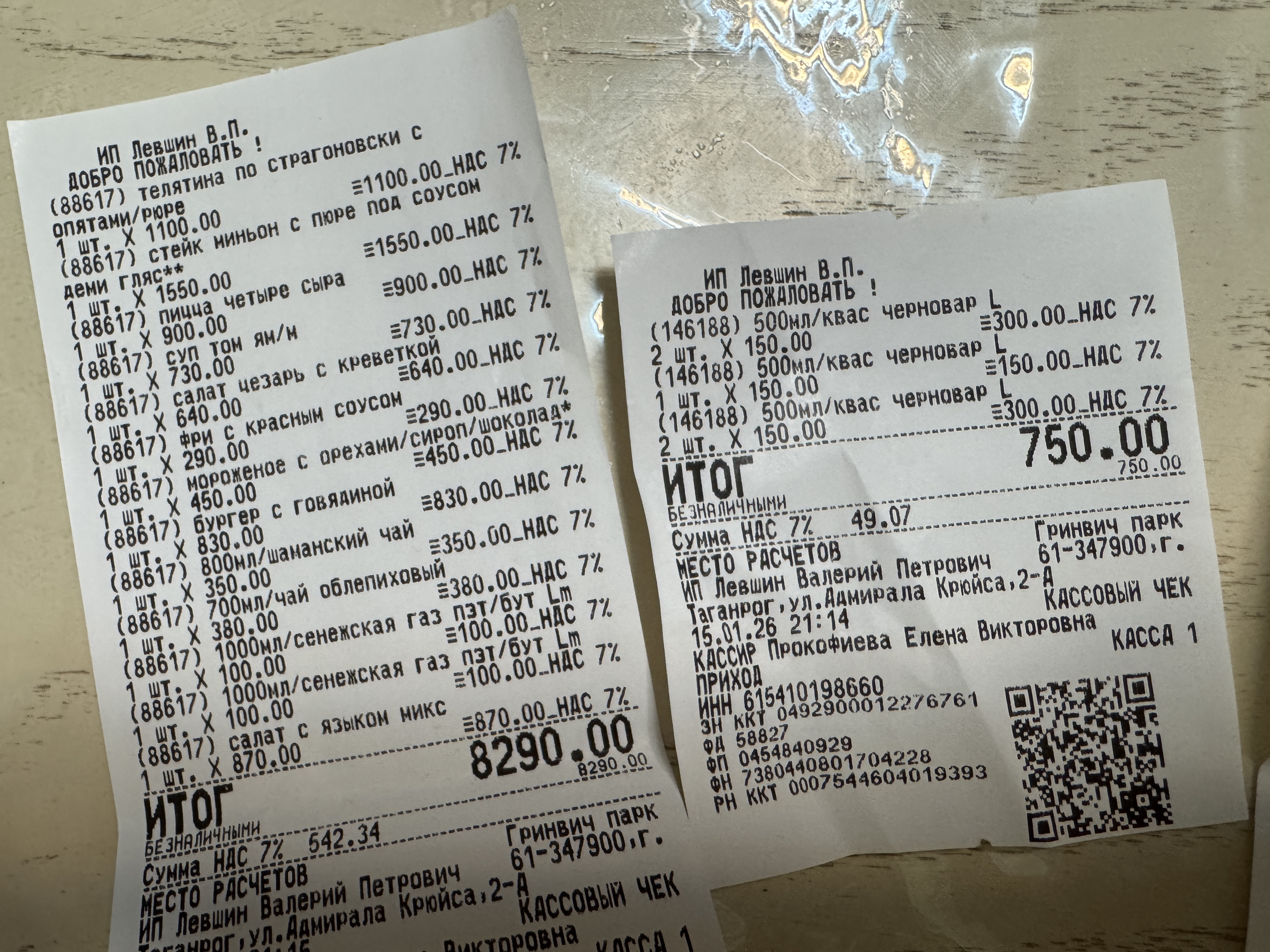 Пока стаааличные мани клянчат 15к на посидеть в спмом крутом ресторане Москвы, обычная посиделочка в кафешке Ростова обходится в такую вот неподъёмную для подавляющего большинства маааасковских мааанек сумму.
