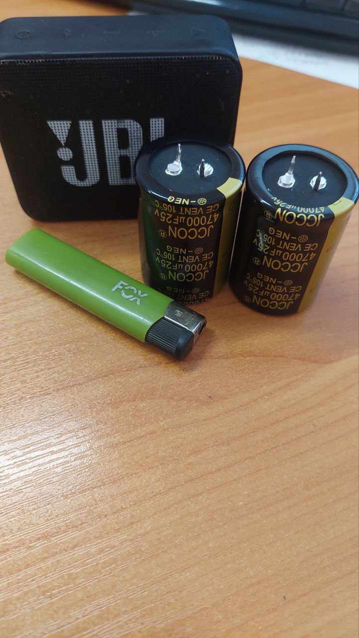 Притараканил два кондюха. Здоровые суки! Буду на питание магнитолы вешать, чтоб не мигала при работе стартера. Имеющихся два по 10000 мкф стало не хватать после смены магнитолы. Походу встроенные блюпупы и прочие приколюхи нуждаются в бОльшем питании.