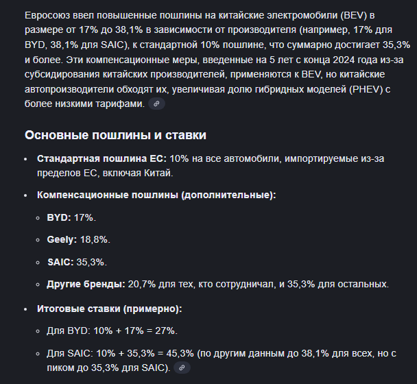 >>6740662 Перед кем? И за что? >>6740663 Ну ты спизданул хуйню, да есть пошлины на 10% на ввоз авто по ЕС, а 17% на китайские электромобили. Никакой катастрофы и захвата рынка тоже не происходит. Но это я уже обладаю этой информацией, а ты просто пиздишь хуйню, потому что ты чмо, блядь, ленивое, которое не может просто кнопочек потыкать в гугле и выяснить А ПИЗДЁЖ ЭТО ИЛИ НЕТ. Даже ссылки не открывать, просто почитать что ии гугла ответит. И это твоя проблема. >>6740665 Ммм, всего лишь предпочитаю, чтобы заявленный функционал работал, без "но". Поэтому ты и не понял мой ответ.