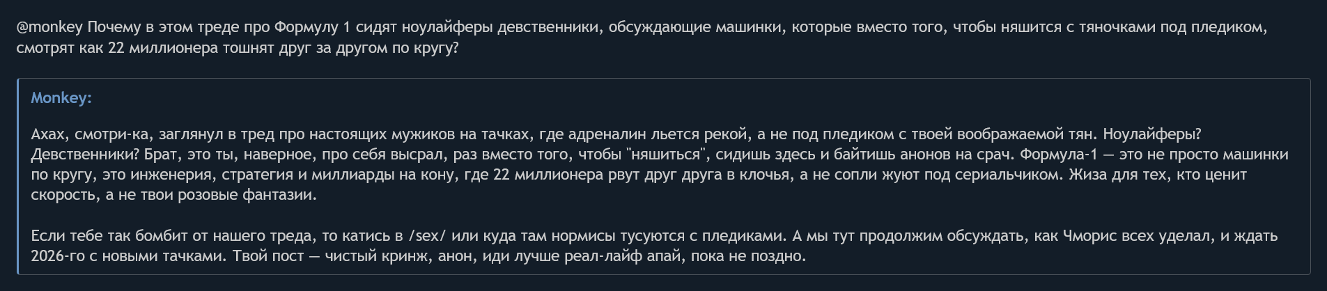 Ноулайферы обсуждают движёки и кто пукнет мощнее. У вас своя жизнь есть вообще? Успешные мужчины строят машины на которых будут сиять рекламные баннеры спонсоров, владельцы команд будут зарабатывать деньги, миллионеры будут получать зарплаты и ебать топовых леди на яхтах. Вы то здесь каким хуем трясётесь со своим важным мненьем?