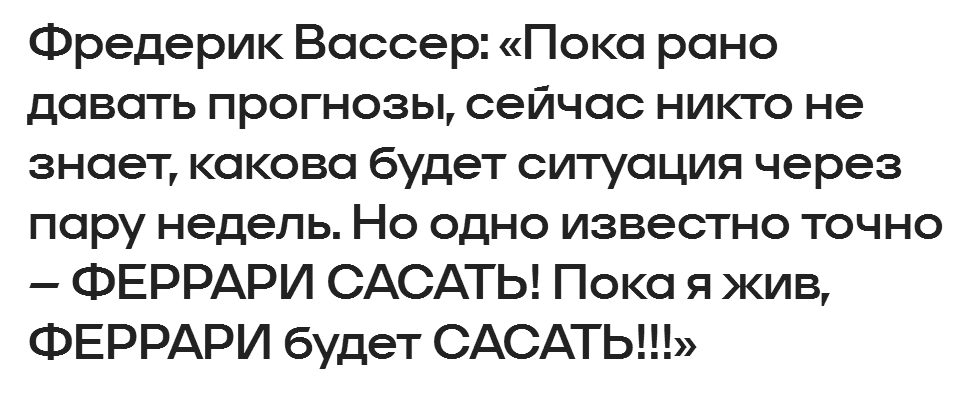 Склонитесь, жалкие жабососы и глоры мерсобеса, падите ниц перед великой командой, перед великой Феррари Аривабене Вассера и лучшим гонщиком современности Шарлем Леклером.