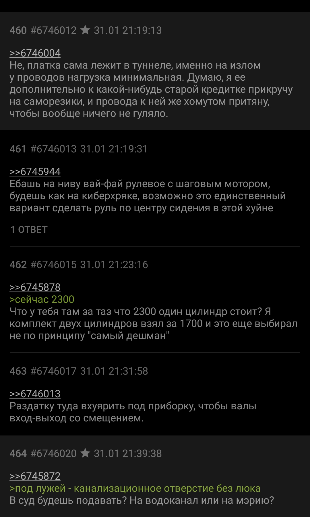 >>6742232 Ага, сижу тут твои вскукареки мониторю целыми сутками, сам перед дежурным кудахом даже погуглить не удосужился > Заруби себе на носу, В семье есть такая машина, так что не тебе дивану меня учить своим фантазиям на предмет дизеля, который ты походу даже не нюхал, только лишь начитался страшилок про современные дизеля, ТНВД, форсунки и прочую чепуху, которую армия, коммунальные службы и коммерческие перевозчики вертели. > в автаче такое не взлетает. Взлетают фантазёры со своим невероятно важным мнением. Впрочем, смысла что-то доказывать или объяснять нет, живи в своём мирке, отвечать дальше впадлу, тот анон сам решит что ему надо.