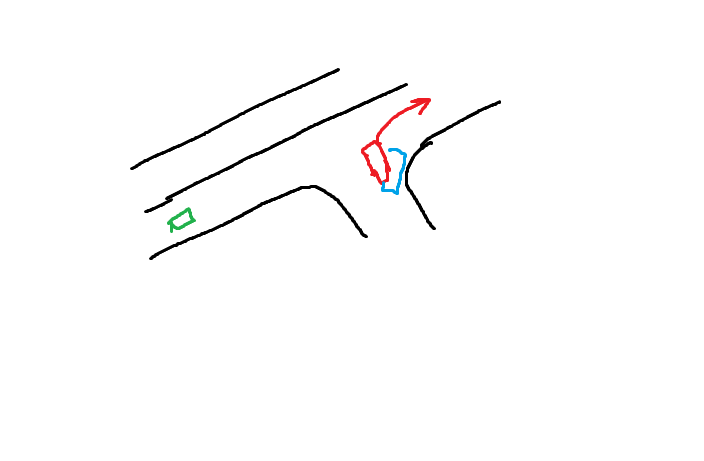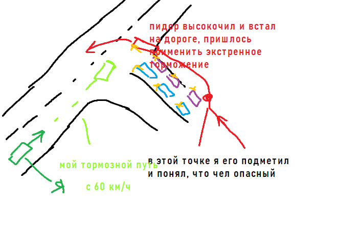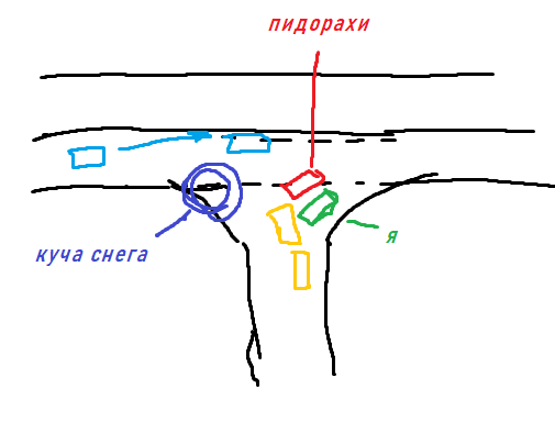 Сегодня два раза чуть не попал в аварию, не по своей вине. Ситуация 1: Ехал по шоссе 60 км/ч, дорога с наледью, колеи. Чуханы стоят на поворот. У дороги такой конфиг, что те, кому повернуть направо не могут это сделать, потому что им не вдино нихуя, им нужно ждать тех, кто повернёт налево. Я уже еду настороженно, потому что по-любому какой-то еблан повернёт направо. Заранее заметил чёрный джип (на схеме красным обозначен пидорас ебаный) он объехал очередь на поворот налево СПРАВА, и хуйнул неглядя на дорогу и встал прям боком нахуй, пскольку я заранее понял, что это опасный ебалн — успел затормозить, тормозной путь составил в райноне 30-40 метров, до еблана я не дохеал метров 5-6, короче охуенно стработал, инструктор проебал момент. Я реще вжал тормоз чем он. Инструктор за каким-то хуем попытался в процессе торможения выхватить у меня руль и уйти влево (тупой), я ему не дал, иначе бы меня занесло на встречку, лучше я въебусь в бок стоящий машине, чем на встречку под фуру.