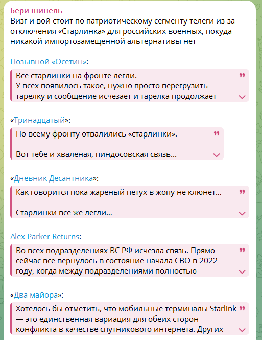 Базовичок Родригес из Но Пасаран говорит у них в бригаде со связью всё заебись и без старлинков. Впрочем его бригада входит в состав доброкора, а в доброкоре по слухам в целом очень ответственно относятся к боевой подготовке. И ваще не всё так просто со старлинками. Действительно был расслабон из-за старлинков, действительно вот прям щас массово нет нормальной альтернативы и есть проблемы. Порки даже взвизгнули что у москалей катастрофа, им подхрюкнули залетухи из верхнего телеграма. А базовички кто в теме лишь ухмыльнулись потому как знали что вот так всё именно будет и заранее готовились, и во многих подразделениях никакой катастрофы со связью нет.