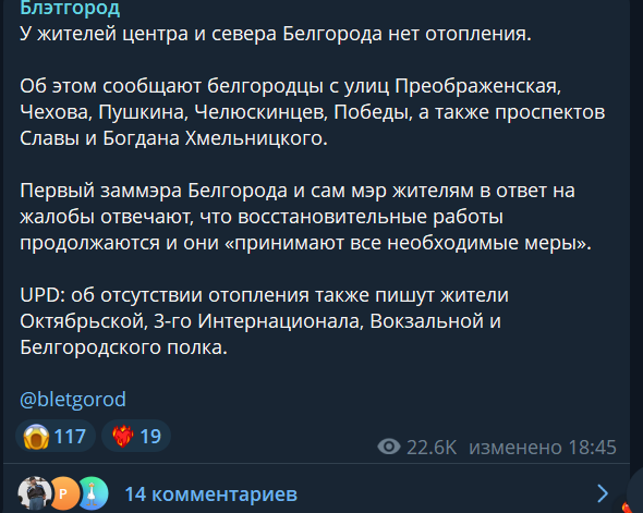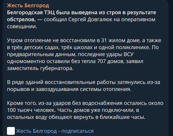 ❗️6. После очередного обстрела энергетики не смогли дать тепло в треть многоквартирных домов Белгорода (455 из 1598), десятки детсадов, школ, поликлиник и вузов. 8 февраля пришлось сливать отопление со всех этих объектов, а жителям предлагать отправить детей в другие регионы или отдать в детсады, где есть тепло, на полный день (с ночёвкой).