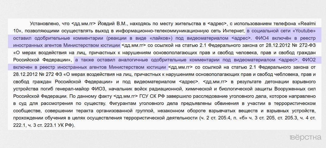 В решении суда указано, что Василий Йовдий смотрел YouTube с телефона и оставлял «одобрительные комментарии — реакции в виде лайков». О каких именно роликах идет речь — неизвестно, но уточняется, что авторами двух из них были «иноагенты». В одном из видео говорилось о смерти начальника войск РХБЗ Игоря Кириллова при взрыве электросамоката.
