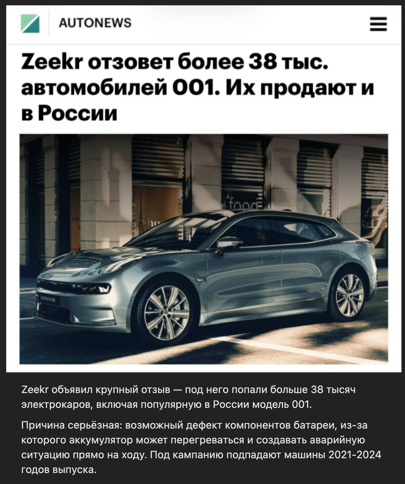 Производитель Zeekr официально признал существование дефекта, отметив, что в Китае с ним чаще сталкиваются в северных регионах.