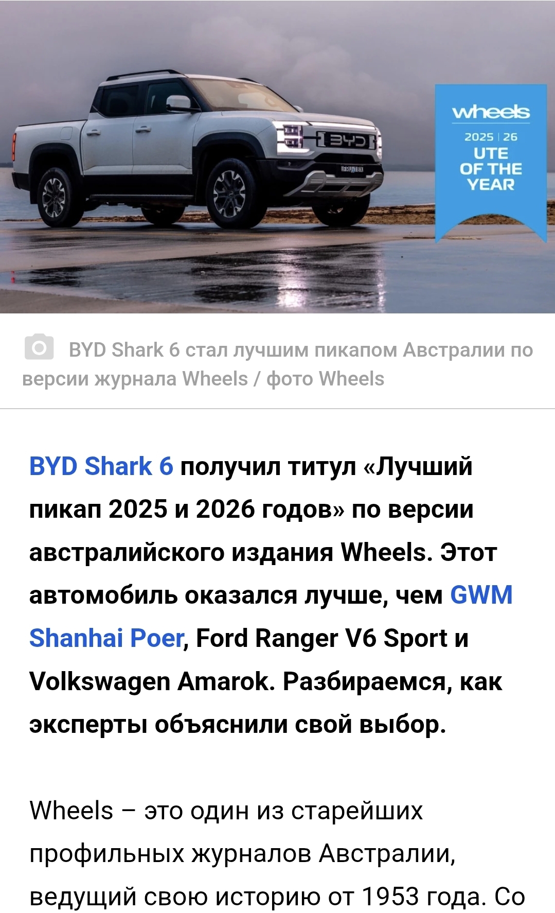 >>6753464 Эксперты Wheels отметили, что тем, кто ищет надёжный пикап для бездорожья и буксирования тяжёлых прицепов, куда больше подойдёт занявший второе место в рейтинге GWM Shanhai Poer с дизельным двигателем. Но BYD Shark 6 всё равно признали пикапом номер один. Во-первых, он стал лучшим выбором для людей, в основном перемещающихся по городу. Shark 6 описали как тихий и «напичканный» технологиями автомобиль, который может двигаться в комфортном полностью электрическом режиме.