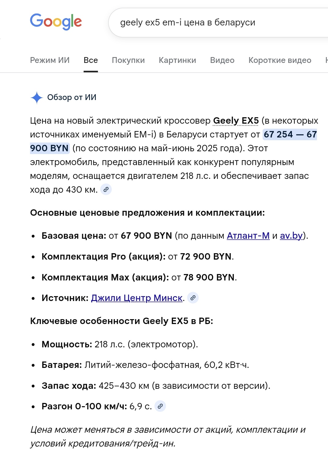 Это фиаско, братан! Почему? Да потому что автомобиль своих денег не стоит! Продал я свою серебристую стрелу - шкоду октавию А7 2019 г.в. с мотором 1.8 TSI, DSG DQ200 и, позарившись на новый китайский автопром, приобрел вот это вот "чудо". Почему? Да потому что на дворе 2026 год с его ожидаемым ростом цен на всё и вся (НДС 22% и т.д. и т.п.); родился третий ребенок и на заднем ряду нужно больше места; шкода прошла более 100 т.км и начала так нехило подсасывать деньги. Почему гибрид? Да потому что хотелось попробовать новые технологии (драйв и экономичность вкупе). Почему именно этот автомобиль? Да потому что укладывался в мой бюджет. Полный привод мне особо не нужен (а его здесь и так нет). Решено. Берем Geely EX5 EM-I (ну и название...) в белом цвете на рыжей (светло-коричневой) китайской, слегка резиновой, коже в максимальной комплектации. Спрашиваю менеджера - "Андрей, такая экокожа, да на такойм цвете наверно будет пачкаться даже от моих синих джинс?!". А Андрей говорит - "Нееееет, ты что! Ничего пачкаться не будет))))". В итоге спустя 350 км на кромке водительского сиденья уже видны следы моих синих джинс))) Андрей, привет тебе большой! Но Андрей не виноват. Едем дальше. Забрал с салона. Заехал на рынок за продуктами, отвез их домой, затем поехал сдаваться в детейлинг. Ну а как иначе?! Шумки в автомобиле за 3,5 млн. (да-да, мне отдали ровно за столько, т.к. выпросил скидку) нет от слова совсем! Отдал машину на полную шумоизоляцию (кроме крыши), антикорозийную обработку арок и порогов и обклейку пленкой передка и зон риска. Забрал через 6 дней, на следующий день обнаружил, что не работает блок физических кнопок управления климатом под правой рукой и обогрев заднего дивана. Поехал в детейлинг, наладили за пару минут - оказалось фишку не до конца воткнули. Затем всю неделю пытался зарядить на эл.заправочных станциях - не получилось! Машина просто не принимает электричество и всё! Никаких ошибок не выдает. Обнаружил, что еще и режим движения Electric не работает (кнопка не активна, не нажимается короче). Сегодня еду снова в детейлинг, думаю, что наверно что-то с массой на кузове... Недокрутили гайку, или может мастикой всё замазали так, что контакта толком нет - не знаю! Так, что там по расходу бензина, если не заряжаться на эл.заправках. У меня по сибирской зиме в режиме HYBRID выходит около 12 л./100 км. Много? Думаю, что это ДОФИГА для такого авто - это тоже фиаско, братан!
