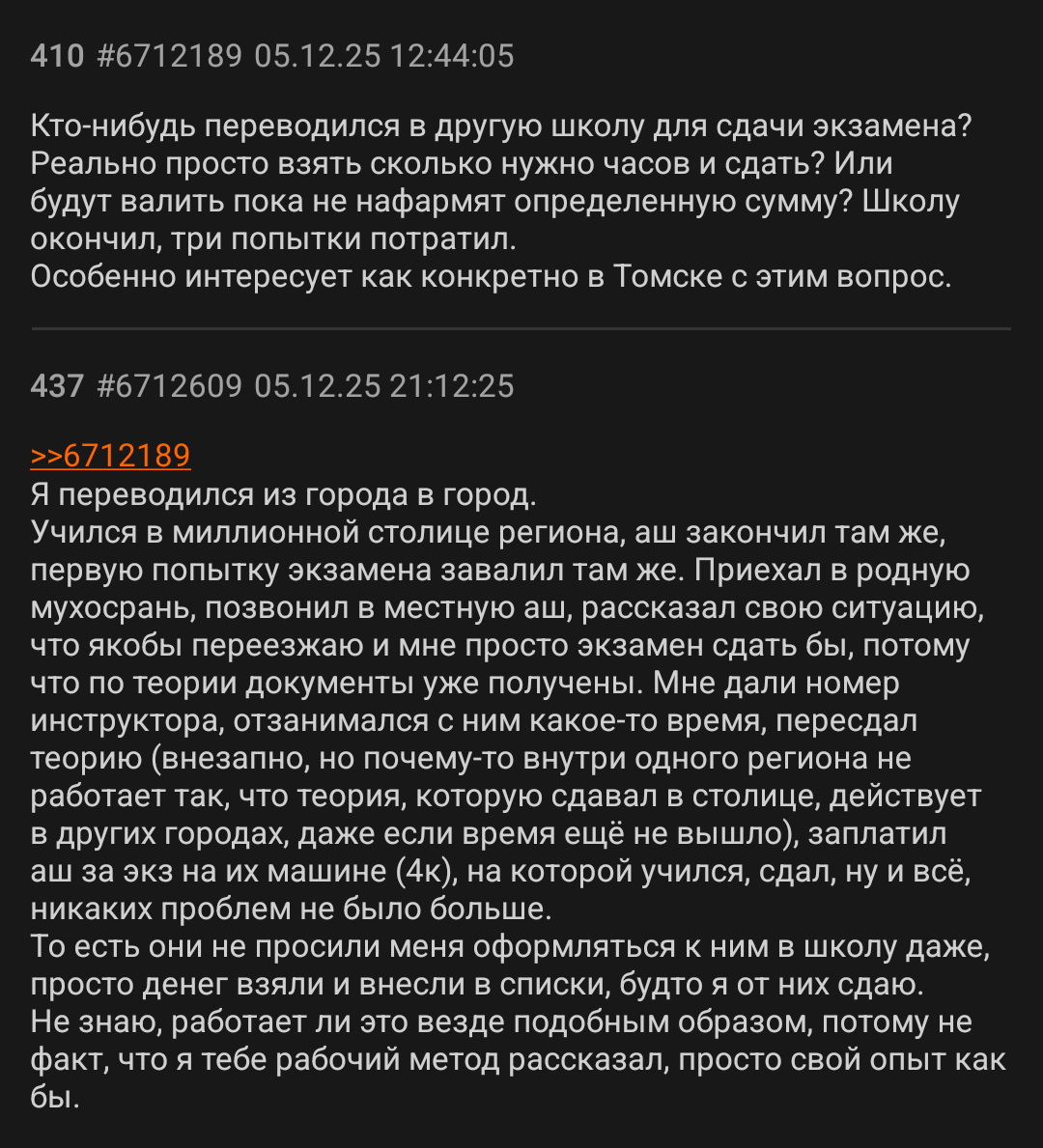 >>6760251 Через пару дней распишу подробно с супом прав, я сдал недавно сам в ДС через госуслуги от онлайн автошколы которую гайцы не любят + было возможно усложнение (т.н. метка в деле), за пьяное вождение без прав лет 5 назад. Заняло получение прав после окончания автошколы чуть больше года, 6 попыток (один завал смог оспорить и отменить). Если кратко - можно, но сложно. Нужна как минимум своя тачка в собственности для нелегальной езды по экзаменационным улицам для насмотренности разных нестандартных ситуаций и запоминания каждого куста, и около 25к на 10 уроков вождения с челиками с авито, которые надрочат любимые валочные команды местных инспекторов.