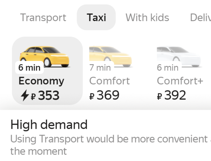 >>6752684 >Грубо говоря, 1 км 50 рублей У меня ближе к сотке за км залупают (на пике поездка 3.7км). Ни пробок, ни ажиотажа, нихуя - просто "высокий спрос" большую часть дня.