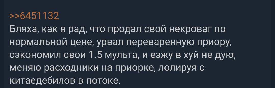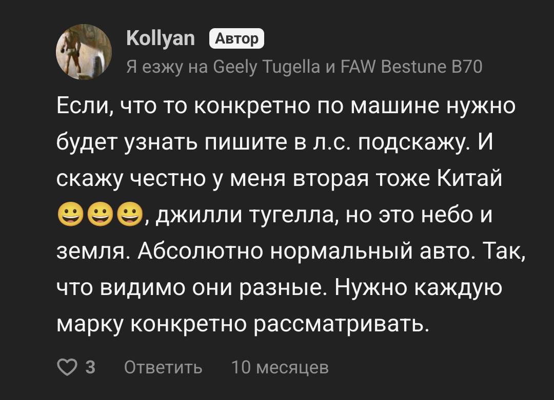 >>6758389 У меня как два год haval f7 1.5L 4wd 2023 года. Пробега уже 42к набежало. Машина хорошая, проблем с ней никаких, ТО на масло в правильном сервисе можно за 8-9к провести, а если со всеми жижами, то 20к максимум, проверено. Чуть в том, что она надоела. Да и комфорта не чую, если ездить больше 30 минут: рулевая колонка имеет очень короткий ход, педали наоборот слишком ко мне близко, позу удобную для расслабленной езды практически не выбрать, а если сбить настройки сидений, то неделю будешь тыкать эти регулировки, чтобы хоть как-то минимально стало удобно ездить, а не на вытянутых руках и с поджатыми ногами. В прадике сидел, в танке сидел, в ф7х сидел - удобная посадка, эргономика. в танке 300 тоже короткий ход, но проблем не почуял Сидел в тугелле, новом атласе - тоже удобно. Сидел в монжаро, а также в других недокитайцах типо ГАК и чанган - неудобно, вся та же проблема, как и на моей машине. Что стоит 3 млн, что 4-5-6 млн - разницы не чую. Разве что танк 500 за свой кэш реально достойный вариант, но, как я сказал выше со своим выбором, я нищий хуесос. Поэтому цена ошибки при выборе - зто значит проеб и моральные страдания. Вижу как дешевеют китайцы - сам на это попался и проебал за годы владения 200к как минимум. А крузак - это типо, на века, ликвидно, 800к на одометре - это он "обкатку только прошёл". Танк 300 - это как крузак, когда тебе можно ехать напролом и комфорт современных технологий. Хавальчик - это как новый смартфон от Сяоми, то есть заебись, только до 100к, а потом в утиль. Да и забудут ее ещё тыщу раз поменяв модель, как это китайцы любят делать. Поэтому взять что-то хочется в их бюджет, что не развалится и не сгниет за время автокредита. Да чтоб можно и всякой хуйни из дома перевезти, на природу с палатками по лесу, в зимой не боясь за бампера боднуть снег на парковке, дороге в своем мухосранске. P.S. За свою я ничего не плачу сейчас, брал за свою наличку.