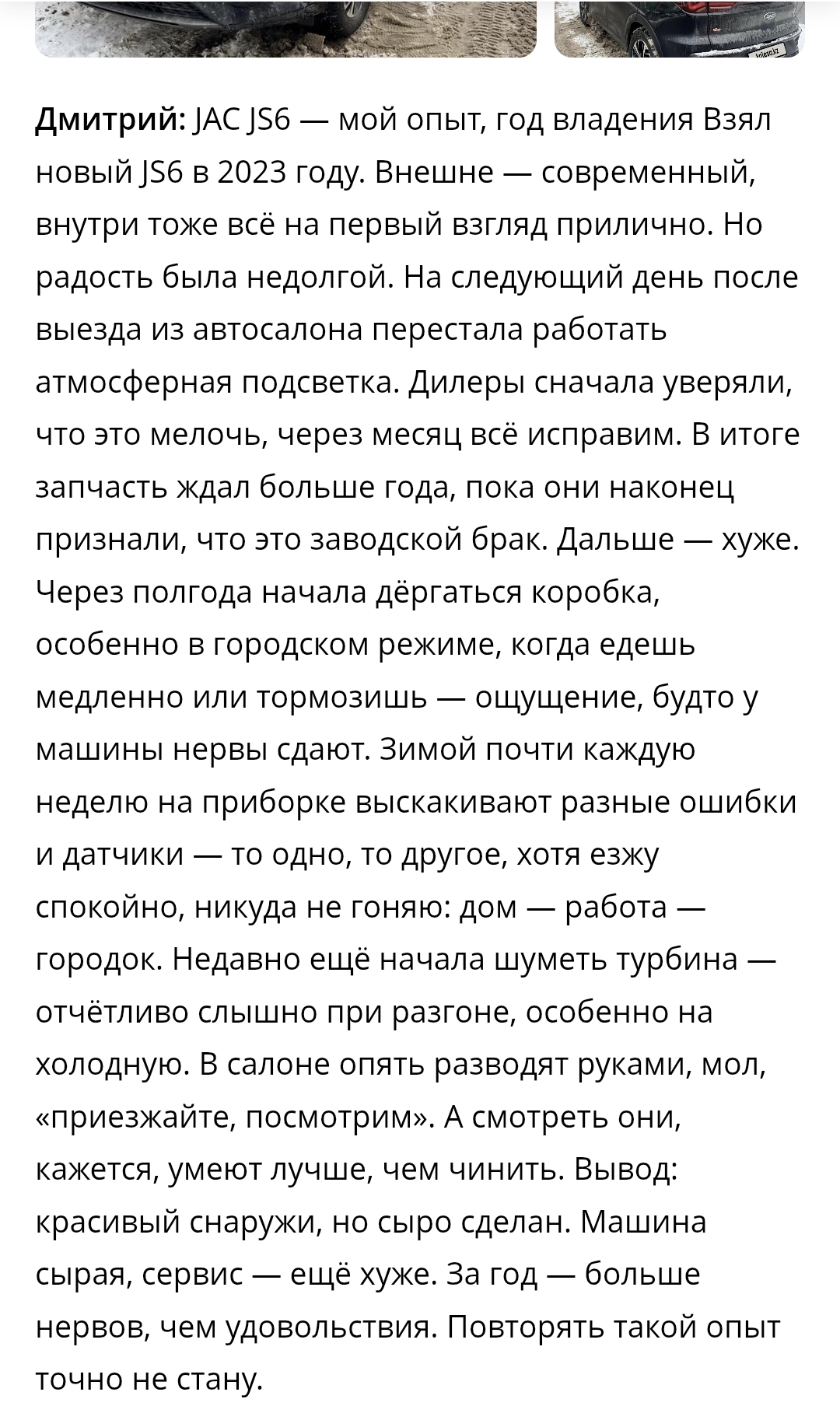 Выдали с работы джолион. Я до этого думал что чери дно, а хавал норм, почти как джили. Нет, ошибался. Отклик на педаль газа ужасающе долгий в режиме стандарт. Он становится непредсказуемым, ты жмешь на газ, 0 реакции, ждешь, ноль реакции, начинаешь отпускать - она рвет вперед. Закономерности по времени отклика нет, оно всегда долгое, но по времени разное. Может вообще не отреагировать пока жмешь и отпускаешь, либо отреагировать через секундку или две. Смешной проем багажника. Он настолько узкий, что туда даже полка родная не влезает. Еще проблема с электрикой и мозгами. Машина иногда не заводится и не закрывается. То бишь ты ее открыл, сел, жмешь на кнопку запуска - ничего. Выходишь закрываешь центральный замок - не закрывается. Неудобная шайба переключения передач. Но это наверное вкусовщина и дело привычки. Мне просто неудобно, иногда вместо d переключает на m