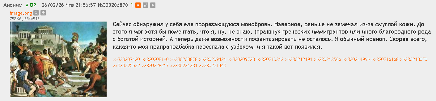 >>330219006 (OP) Я называл друзьями двух людей, и их истории не слишком примечательны. 1. Свалил в аспу в Гермаху, к окончанию аспы его уже доконала родина Геккеля, и он свалил было назад в Россию, но тут грянул февраль 2022, и он спешно вернулся. До сих пор общаемся. 2. Свалил в аспу в Швейцарию, переквалифицировавшись из физика во врачи и вскоре перестал выходить на связь. Спустя года три написал, но общение уже как-то не задалось, потом грчнул ковид и в его голосе появились депрессивные нотки, а после начала гойды выяснилось, что на почве одиночества и стресса он сошёлся с местными полезными идиотами, перекрасившись из сочетания комми и демшизы (он натуралтно предсказывал рухнум после олимпиады 2014) в стереотипную портянку. После начала гойды, которую он уже приветствовал, он поругался с кем-то из коллег и вернулся в Россию аккурат в разгар мобки. Говорил, что якобы хотел пойти добровлльцем, но его не взяли. Сейчас живёт в Москве и срёт в школьной конфе каким-то чудслопом, но мы уже особо не общаемся.