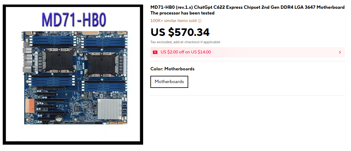 >>326308803 Ну, беглый взгляд на алик показывает с одной стороны хуананжи за 1600 баксов(!) и асус за 400, с другой - что-то непонятное по 20-50. Алсо есть TYAN за 130.