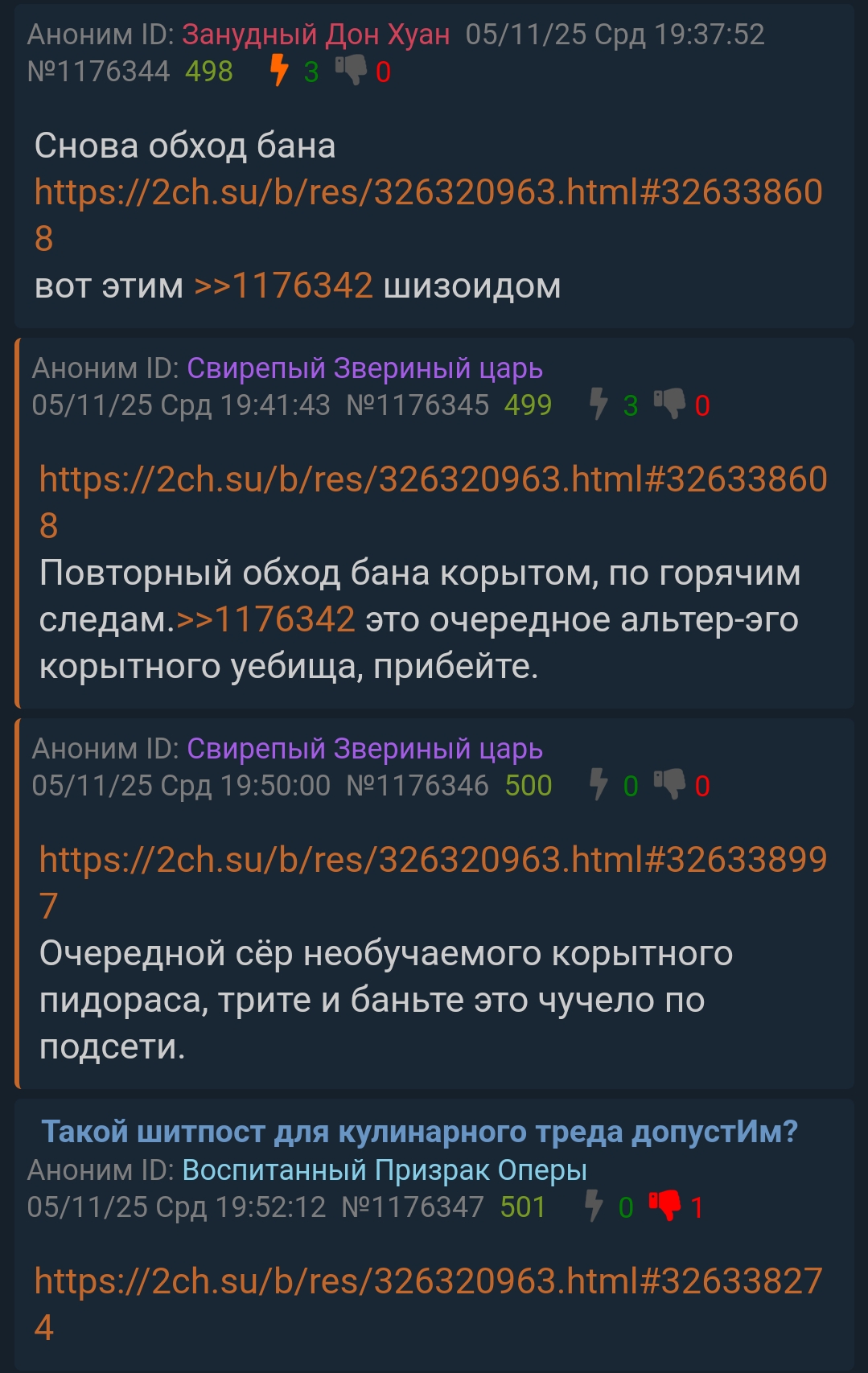 >>326332647 Этого шиза из тематики поперли, ибо он там всех заебал. И из этого треда тоже поперли. Теперь этот дегенерат создал свой тред, куда пытается заманить порядочных кулинарных анонов. Зайди туда и ты кроме шизы этого семена и толпы ссущих в корыто ничего не увидишь. Репорти уебка.