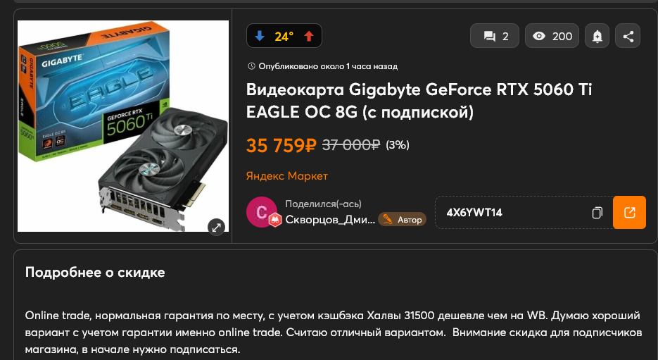 ребят, раз вы тут все собрались (я днём создавал тред стоит ли ее покупать или подождать чёрной пятницы или вообще что то придумать с 5070) мне пару калек ответило и я все таки пошел брать. Помогите со сборкой пж, у меня ток ноут был на 1660ти который грелся и нихуя не тянул. Я вот совсем без пк типа, в общих чертах ток понимаю, сверив инфу. и да, когда лучше собирать оставшиеся части, щас, на 11.11 или к нг? Остался проц, думаю с Лохито купить его р5 7500ф Малазия (чтоб разогнать до 6000мгц озу) - 12900₽, ссд могу щас на ВБ купить адата 900 - 6600₽, а вот остальное все дорого пока, даже плашки ОЗУ нет, не попадаю в бюджет если щас собирать или прям 105к