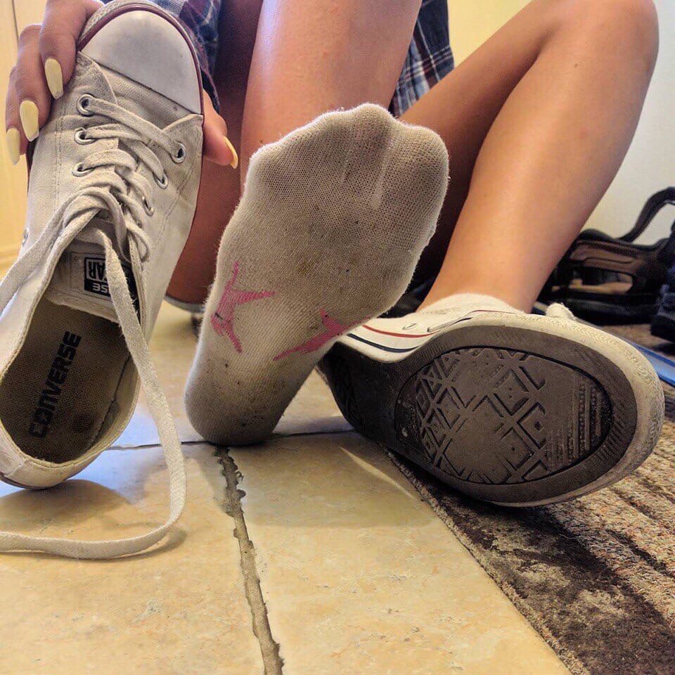 Она на нижней, я на верхней полке, темновато. Я тихо слез, ноль реакции, только ее храп и посапывание. Сначала долго играл с ее кроссовками и валявшимися в них белыми потемневшими носками, во всю нюхал их. Потом присел, и прямо ее ножки мне в лицо смотрят. Очень близко, в самый впритык, носом к ее ступням. ОХ БЛЯ...КАК ЖЕ ОНИ ПАХЛИ! Не выдержал и носом уже чуть уперся ей в ступню, почувствовал легкую влагу и липкость. Не смог уже сдерживаться и быстро пошел в сортир поезда. Там буквально сделал два натяга и озалупливания своего стоп крана с налившимся очень красным набалдашником, тут же выпустил две огромных белых масляных струи. И капитально залил стенку сортира, пришлось чуть вытирать бумагой.