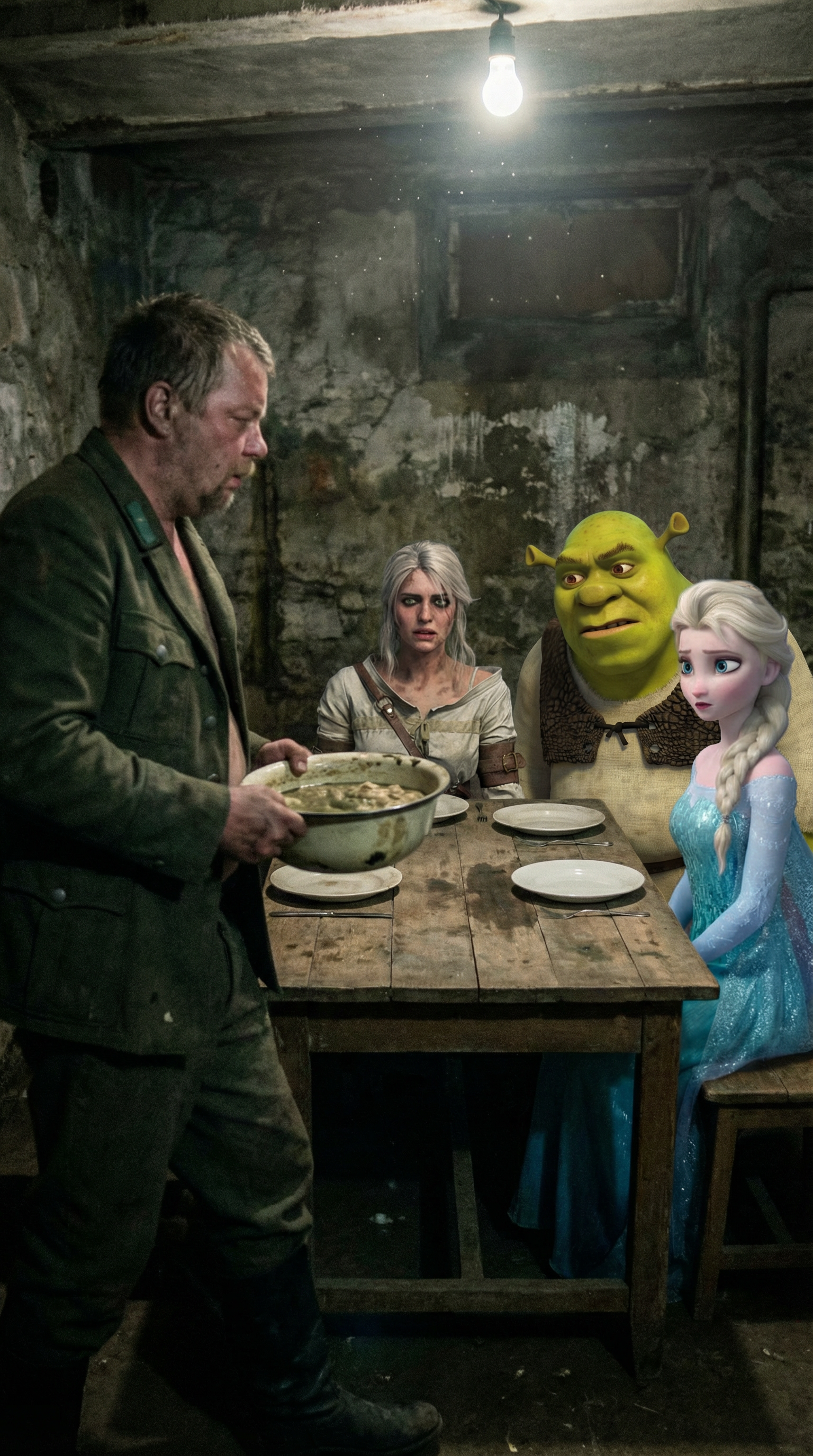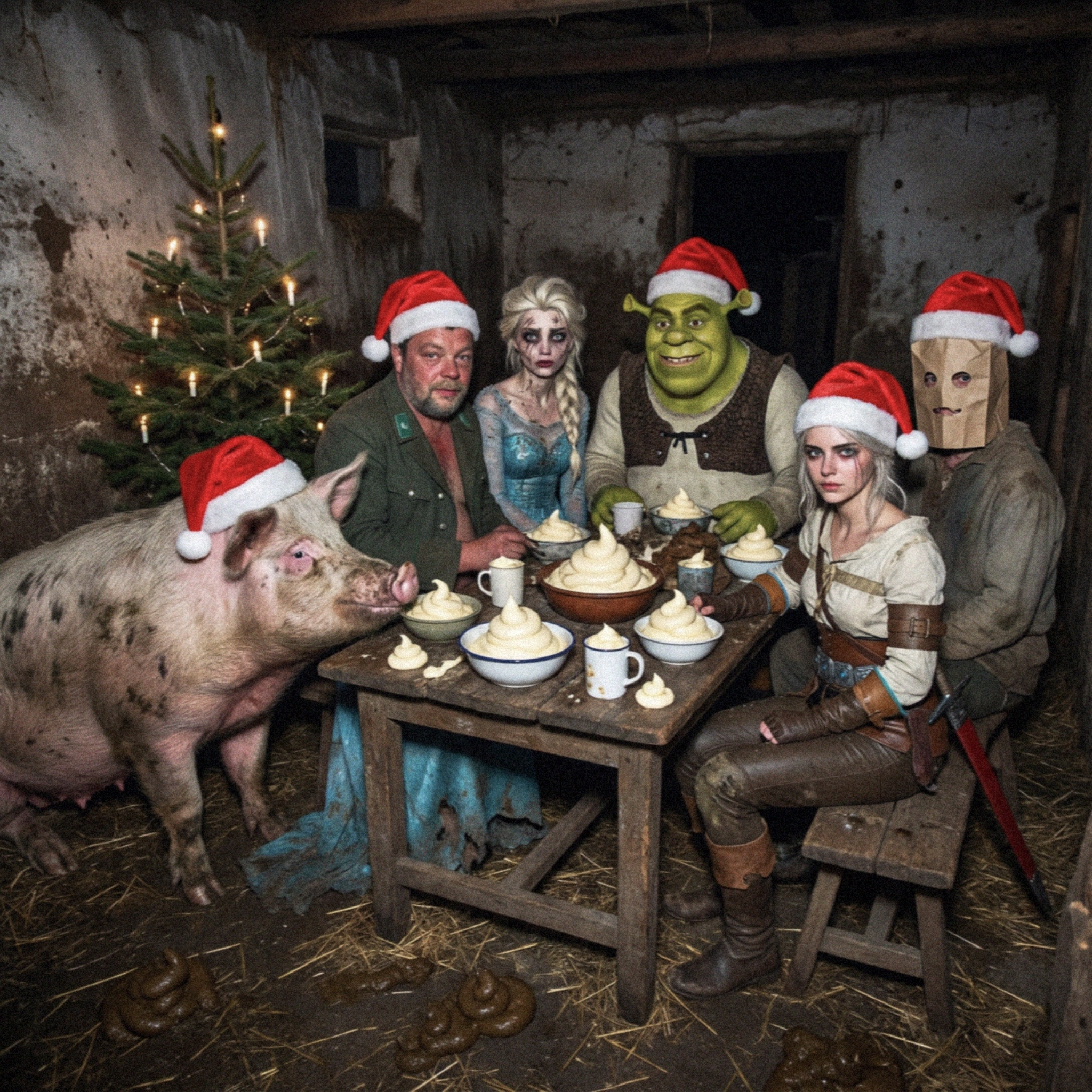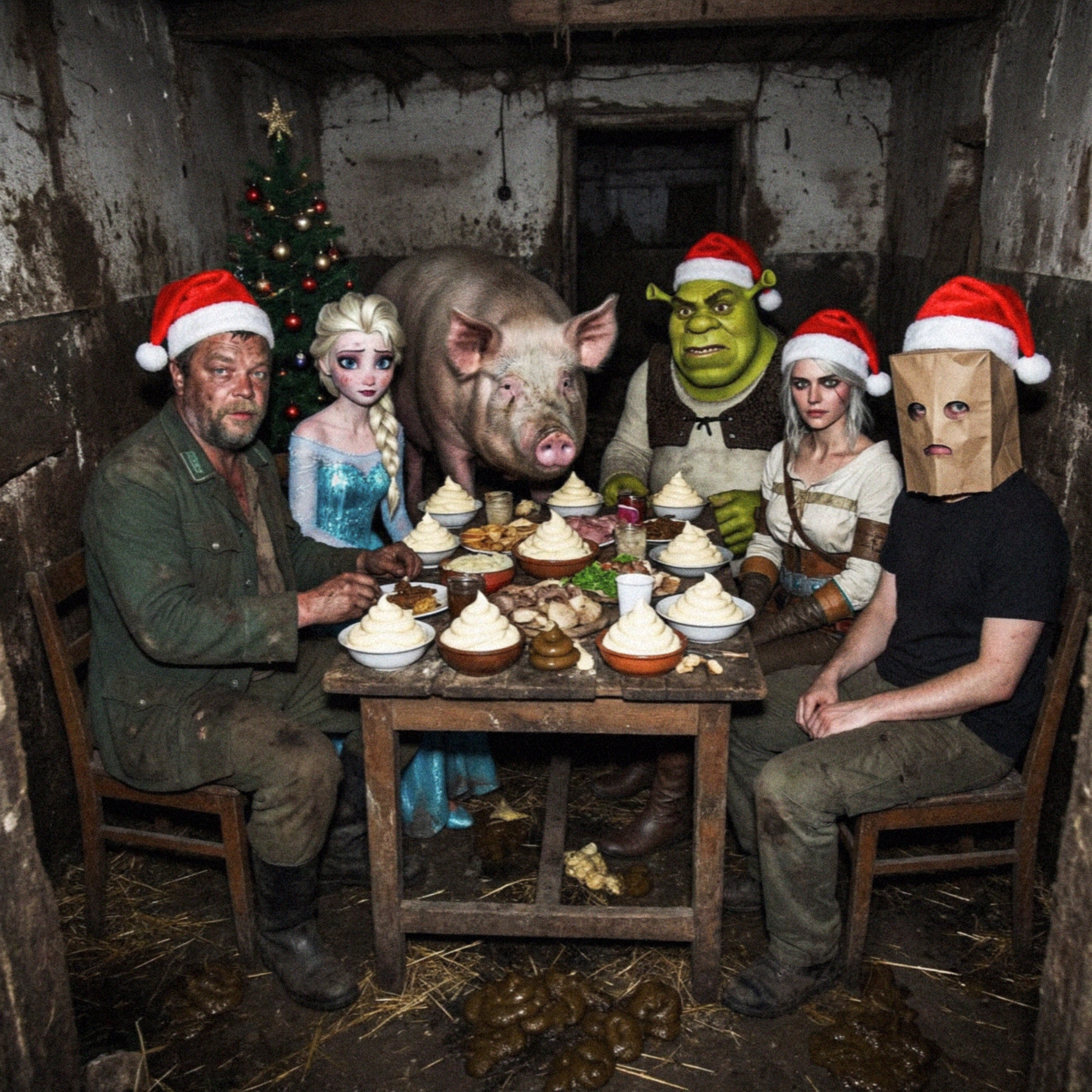 12 ЧАСОВ НОСИТЕ СТОЛЫ И ТАБУРЕТЫ И РАЗНЫЕ БЛЮДА @ КОНСКАЯ ПОРЦИЯ ОЛИВЬЕ, БУТЕРБРОДЫ С ИКРОЙ, СЕЛЁДКИ ПОД ШУБОЙ, ТОРТЫ, КОМПОТИКИ, ШАМПАНСКОЕ, КРУЖКИ ЛИМОНОВ И 20 ВИДОВ НАРЕЗКИ @ СТОЛ ИДЕАЛЕН @ КОРОЛЕВА АНГЛИИ ТАК НЕ УЖИНАЛА @ СТОЛУ НУЖНО 8 НОЖЕК, ЧТОБЫ ВСЁ ЭТО ВЫДЕРЖАТЬ @ ТЁТЯ КОБЫЛА РЕЗКО ДОСТАЁТ ДВУСТВОЛЬНУЮ ХЛОПУШКУ ЗАРЯДОМ ПО 20 МЕГАТОНН @ БУБУХ! @ ВСЯ ЕДА НА СТОЛЕ ПОКРЫТА САНТИМЕТРОВЫМ СЛОЕМ ПЛЁНОЧНОГО ФОЛЬГИРОВАННОГО КОНФЕТТИ @ ОЙ)))))