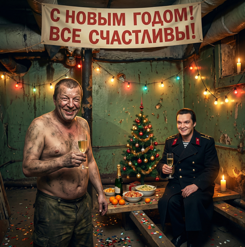 Близняшки-балерины из Atomic Heart с красными новогодними шапками на головах, Yorha 2B в мини-костюме санты, Мита из Мисайд с тарелкой мандаринов в руках и Ева из Stellar Blade сидят за новогодним столом в типичной пост-советской квартире за новогодним столом. На столе множество еды и бутылок с алкоголем. Все кроме Миты держат в руках бокалы с шампанским и смотрят в окно, в окне виден праздничный салют. Все девушки выглядят как реальные люди. Изображение похоже на качественную фотографию со вспышкой.
