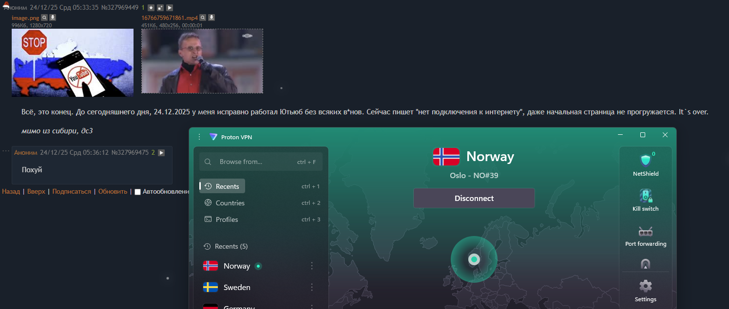 Всё, это конец. До сегодняшнего дня, 24.12.2025 у меня исправно работал Ютьюб без всяких в*нов. Сейчас пишет "нет подключения к интернету", даже начальная страница не прогружается. It`s over.