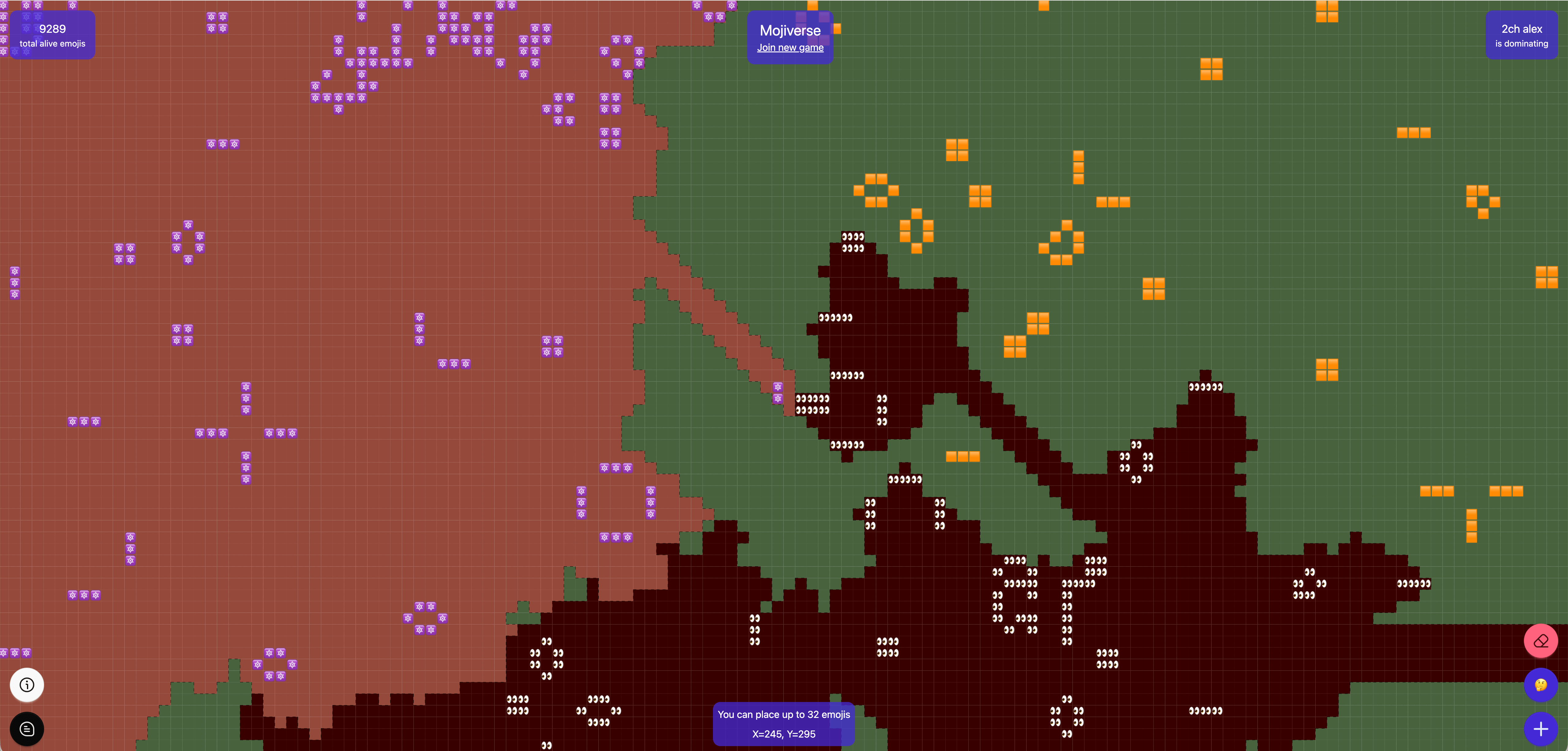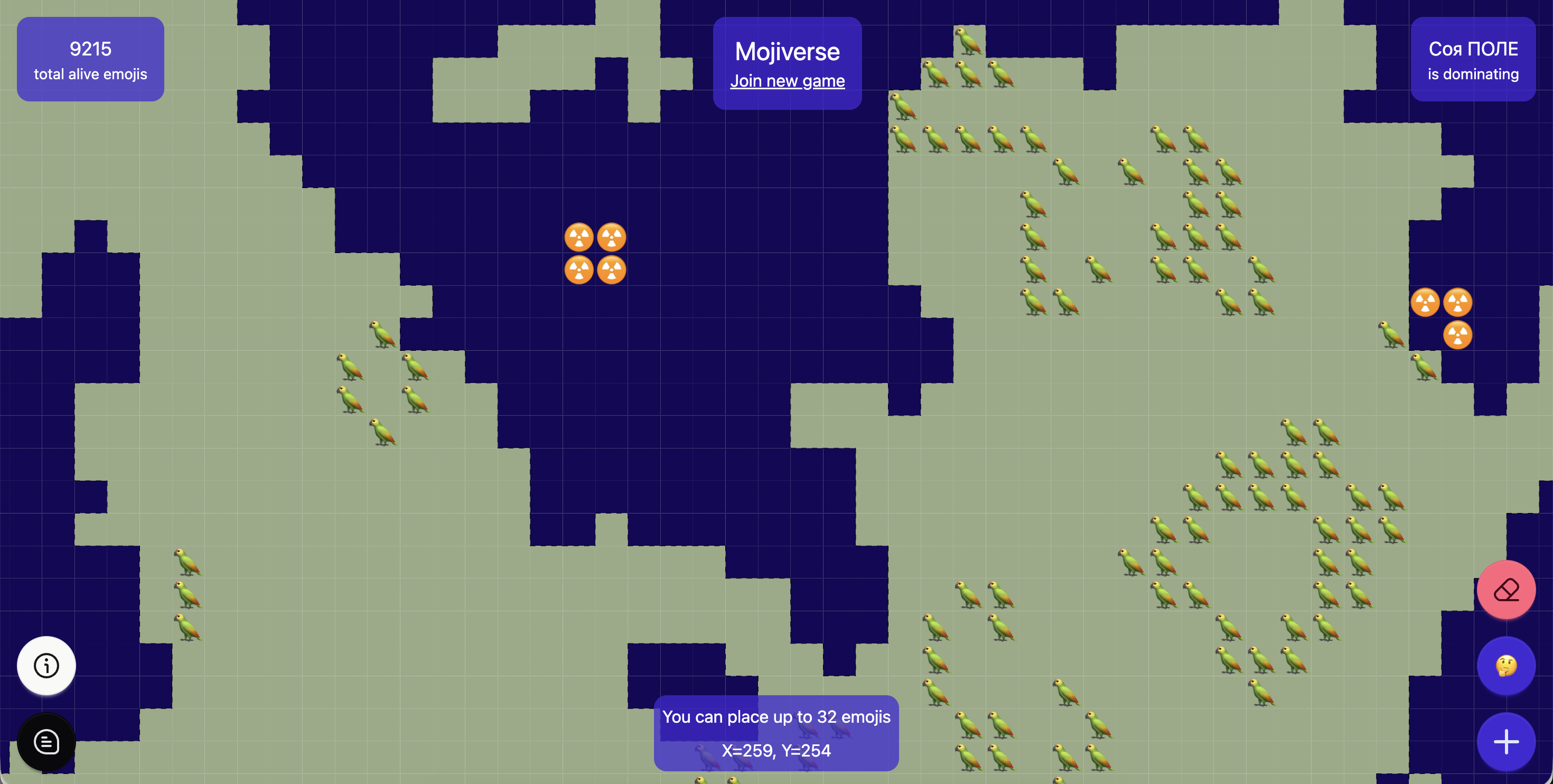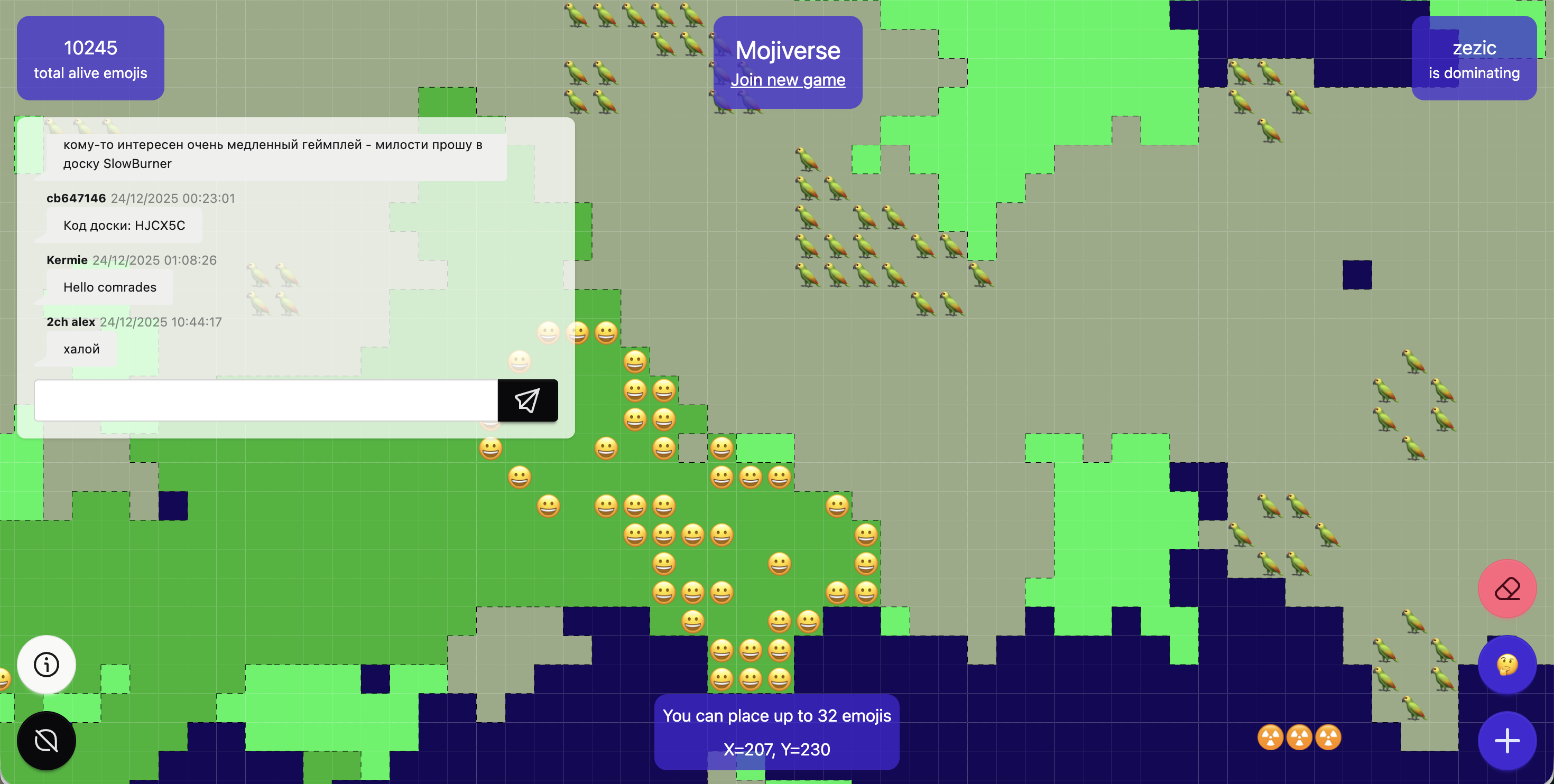 Mojiverse тред средовой"Жизнь" эмодзи с захватом территорий.На форчане жалуются, что слишком сложно, но играют. Двачеры не жалуются, но тоже играют.В последнем обновлении появились юзер-доски с кастомизируемыми параметрами симуляции.ИГРАТЬ: https://mojiverse.art