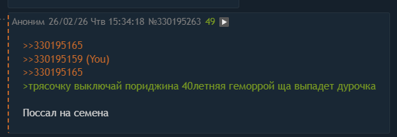 >>330195035 >пук пук пук по делу чо скажешь лох цветочный или два матюка три точки и обиделась старость ходячая? спок пориджики у меня каловой массы на вас всех ветеранов защеканских хватит