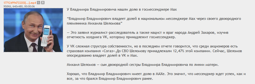 >Белые списки v2.0, с невозможностью выхода в глобальную сеть Логика ребёнка который рассуждает категориями: запрещают только потому что злодеи. Мотивация на уровне злодея из конвселенной марвел. >MAX как единственное средство взаимодействия с отечественной экосистемой всего - от OZON до МФЦ - на базовом уровне >МФЦ Что? В МФЦ ты приходишь ножками, и средство взаиможействие с ним это паспорт. МФЦ на то и нужен что у тебя может не быть компьютера и телефона, не то что с экраном, а просто телефона.