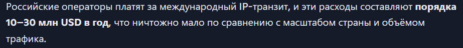 >>330234701 Есть нюансики. Т.к. европейские Tier-1 операторы отвалились, то международный трафик идёт в осноном через азию - Гонконг, Сингапур, ОАЭ. Их пропускная способность ниже чем у европейских операторов, ацены выше. Так что умножай эти 100 млн в полтора раза и при этом урезай объём транзита. А если хочешь больше транзита (чтоб как на довоенном уровне), то это было бу на аукционных условиях. То есть ещё дороже. Раземеется никто не хочет. Аукционые закупки это гипотетическая ситуация, а не реальное событие. И прибавь к этому отключение кеширующих серверов гугла, которые кешировали 80% трафика. Без кеширования суммарные платёжки за трафик ютуба и всего остального тяжёлого вырастают в 5 раз. Хоба и теперь это 700 млн долларов. Заметь, не рублей, выраженных в долларах, а настоящих долларовых долларов. Которые вынь да полож. Да ещё будь добр найди через какой банк такие суммы пересылать. Пиздос. Проще заблочить ютуб.